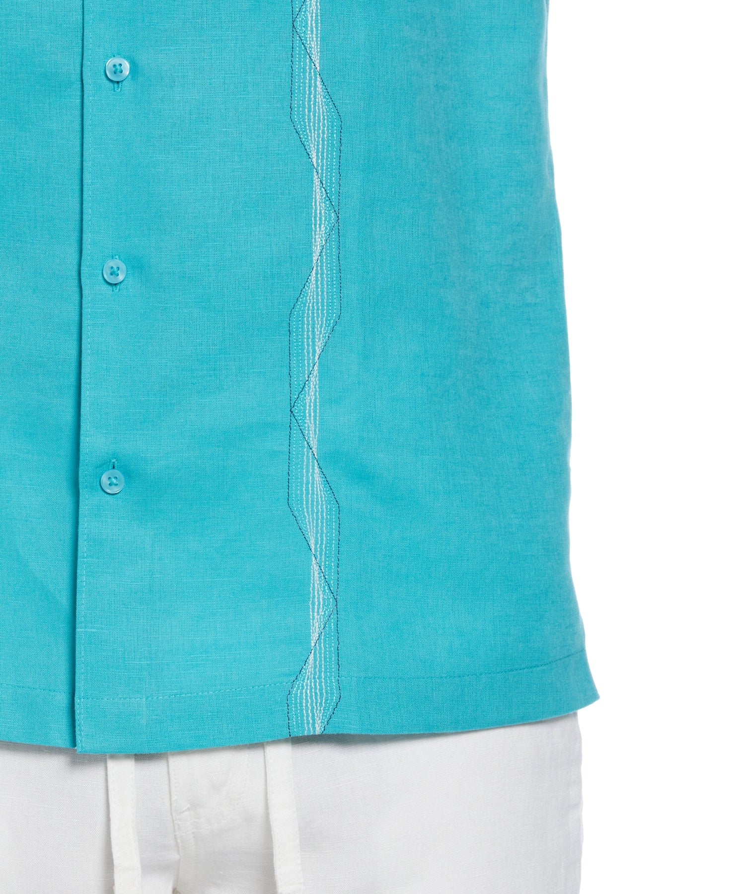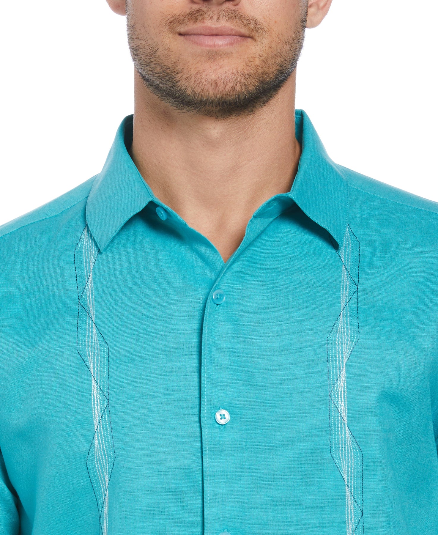 Experience an ideal blend of comfort and style with this men’s tropical shirt from Cubavera. Made with breathable linen blend fabric and featuring durable plain weave construction, this short sleeve button-up shirt is designed for long-lasting wear in warm climates. Geometric embroidery down the front panels adds a touch of sophistication, making it an ideal choice for both casual strolls around town and more formal family get-togethers. With its short sleeves and timeless button-down style, this shirt offers a relaxed yet refined look.