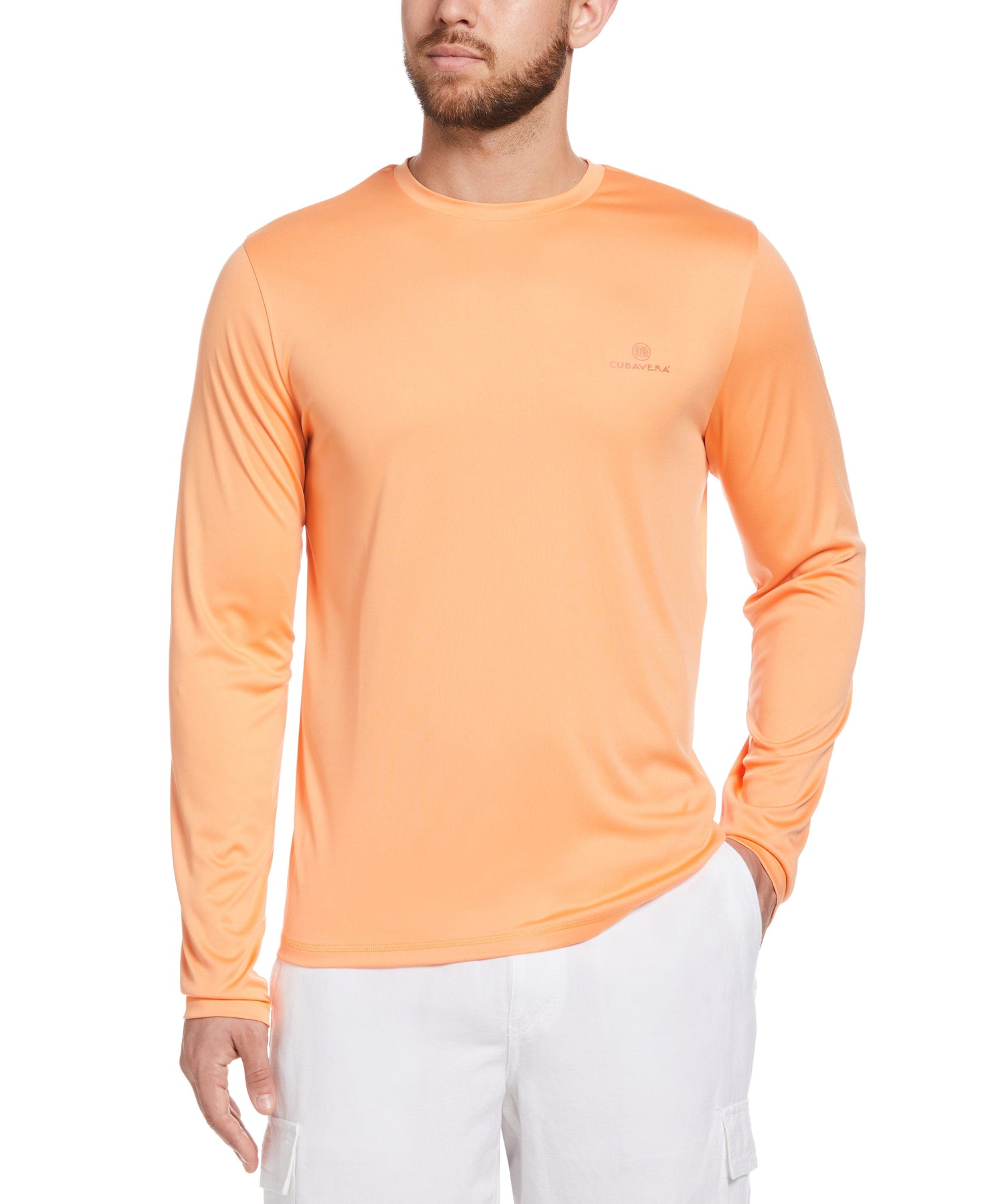 Prepare for sunny days ahead with this practical men’s long sleeve shirt from Cubavera. Designed to help protect against damaging UV rays, this crew neck shirt offers plenty of coverage and smooth, durable double knit fabric. The material offers a comfortable hint of stretch, and it wicks away moisture to help keep you dry in hot and humid weather. A graphic print on the back featuring a pineapple brings a laidback vibe to the design and the neck is tagless for added comfort.