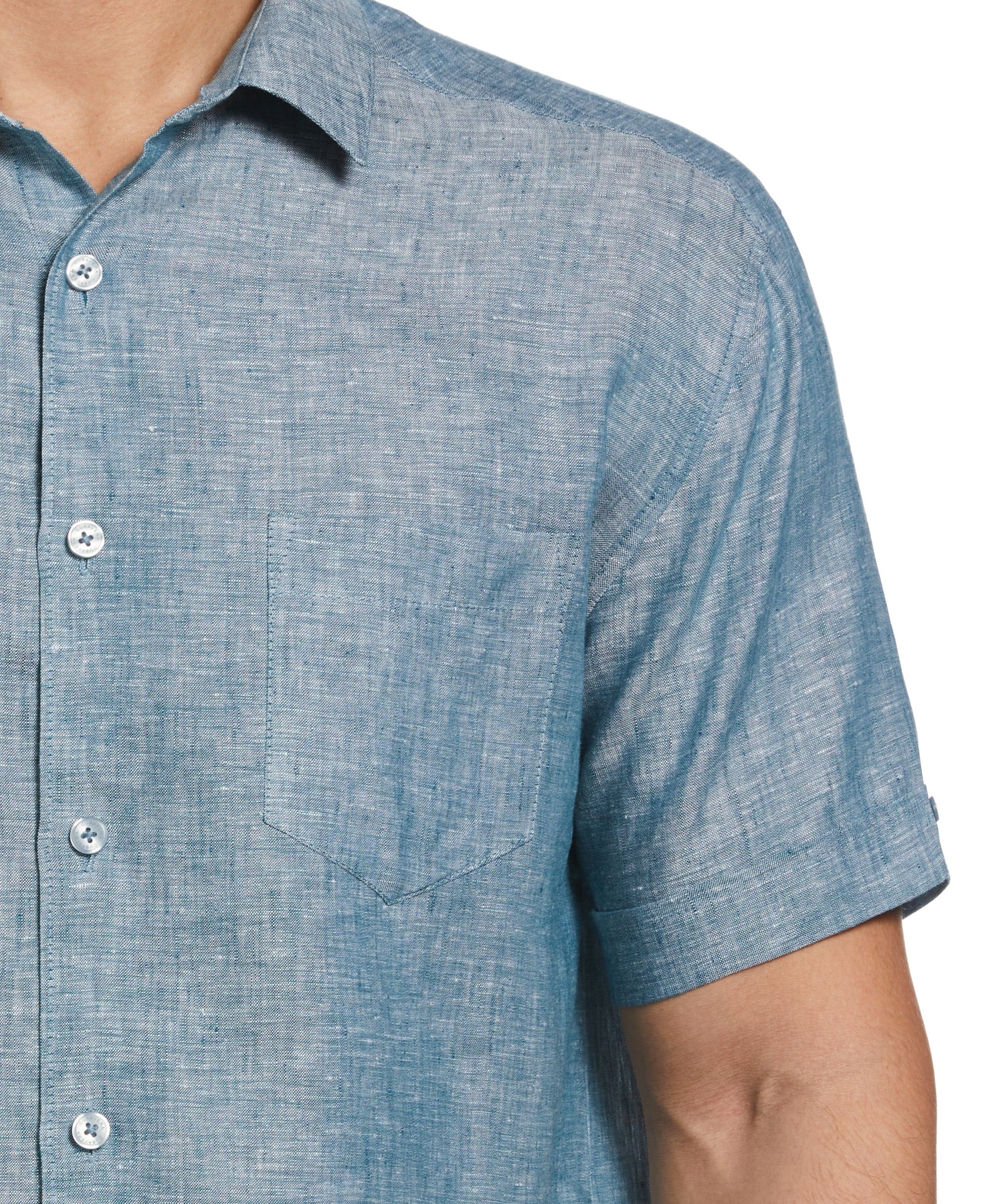 Classic, cool and stylish. This men’s short sleeve shirt is crafted from 100% linen for lightweight breathability and cross-dyed to add subtle texture. The button-down, one-pocket design is versatile enough for day or night. Pair it with your favorite Cubavera shorts or pants for an effortless look.