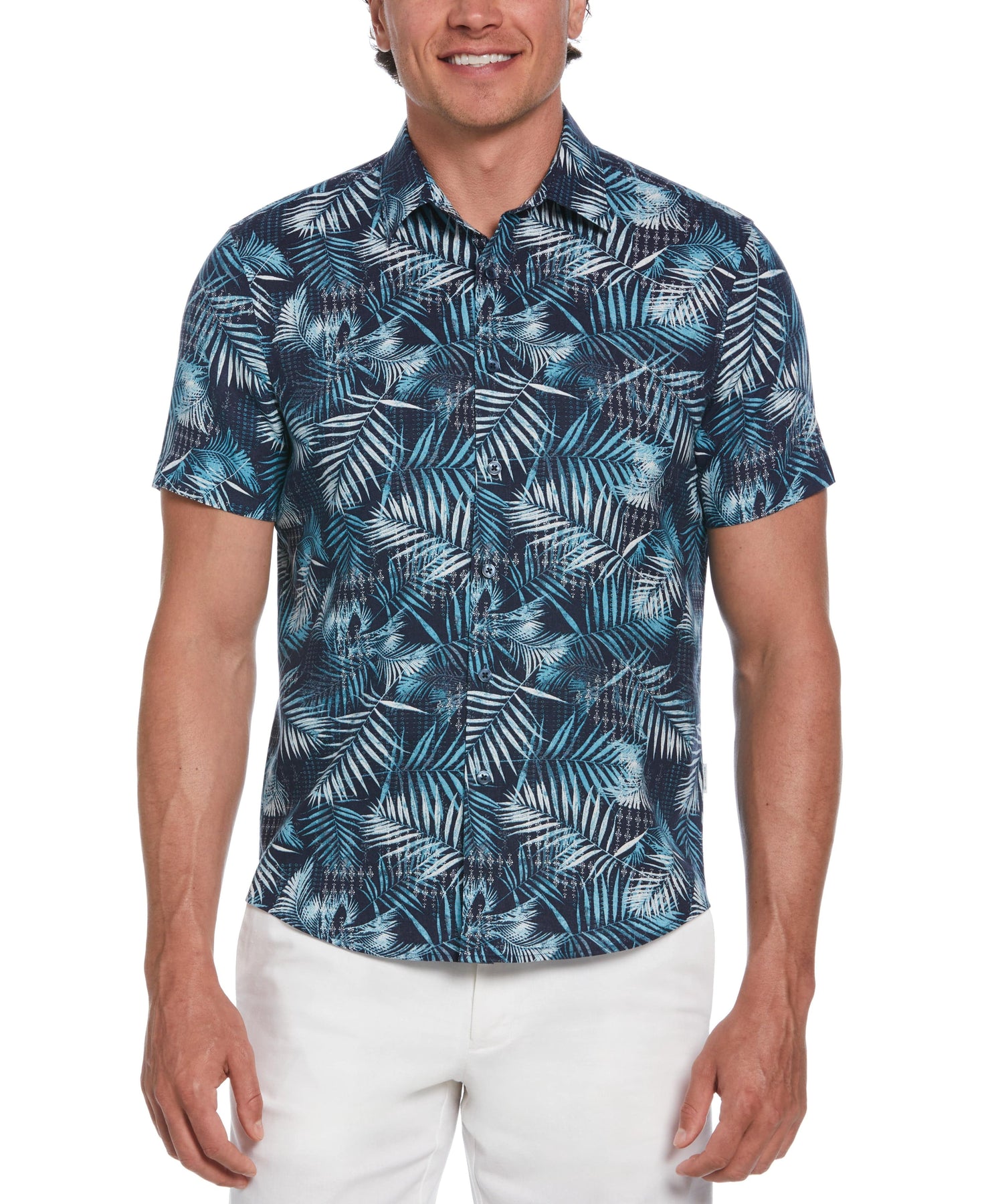 Comfort and style unite in this men's short sleeve button-down shirt from Cubavera. The abstract geometric leaf print is a unique but versatile addition to any outfit. Durable plain weave fabrication and a breathable linen-blend fabric help ensure your comfort, day or night.