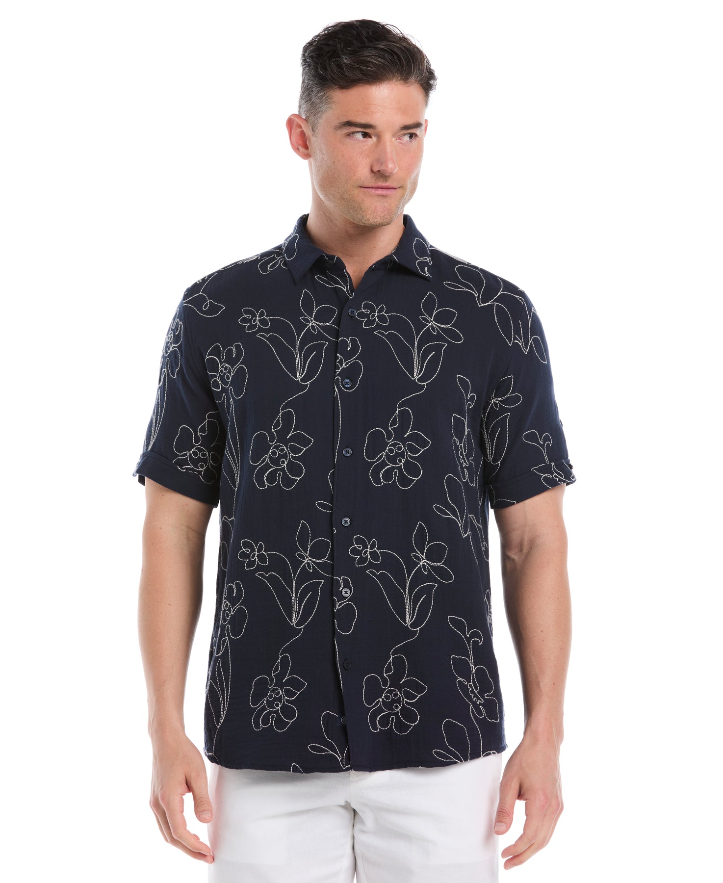 This Cubavera men's short sleeve button up shirt will bring new energy to your everyday looks. All-over embroidered design adds a stylish touch to this timeless staple. Woven with breathable cotton fabric, this versatile shirt will keep you cool while ensuring long-lasting wear. A polished point collar finishes this timeless short sleeve button up you'll want to wear again and again.