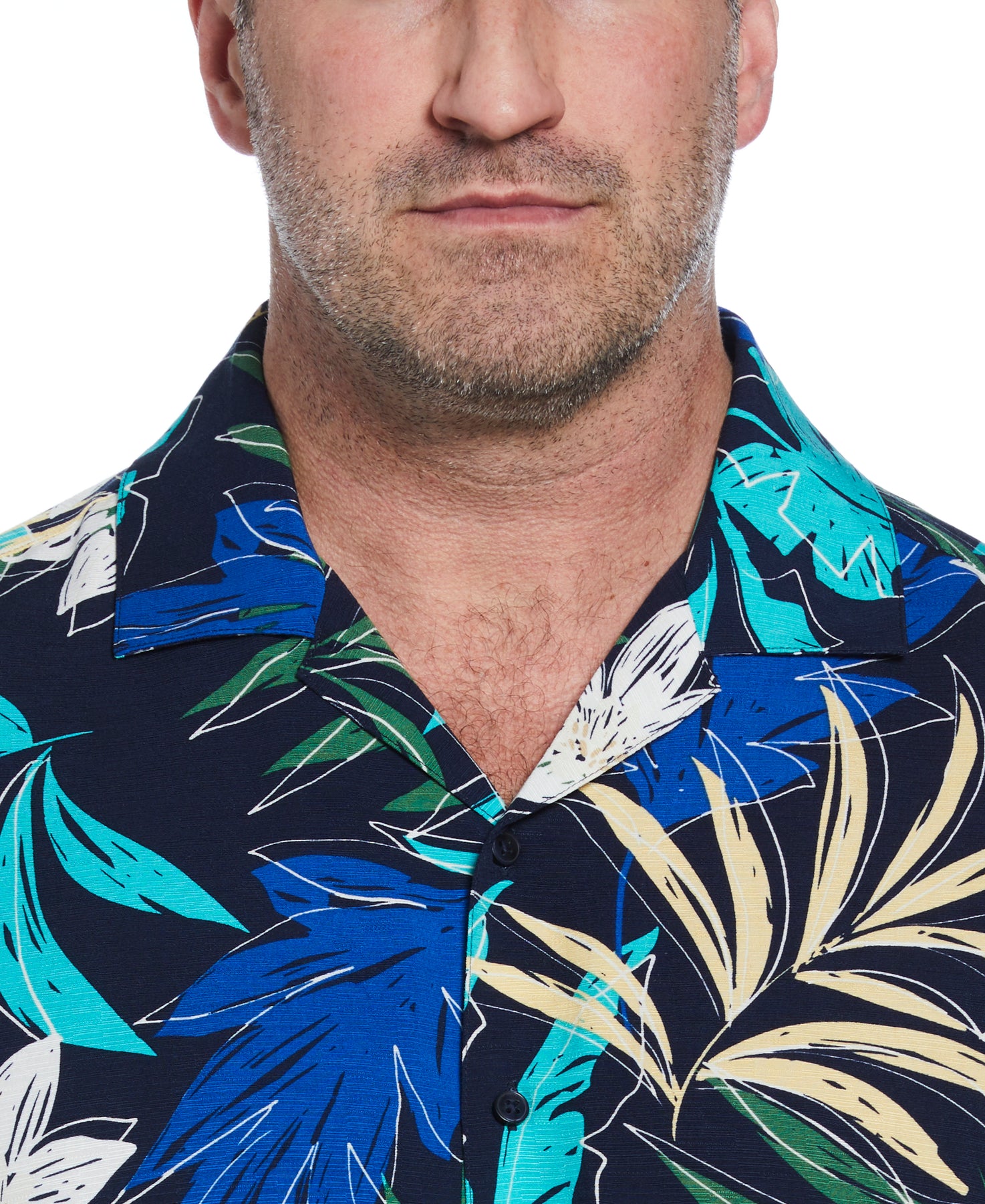 Evoke the tropics wherever you are in this Cubavera men's short sleeve button up shirt. Textured 100% viscose fabric creates a fluid cut that delivers comfortable, effortless wear. An all-over tropical print in a refined color palette adds sophisticated fun to your look that makes dressing a breeze. The Cuban collar completes this button-down shirt for a touch of retro styling.