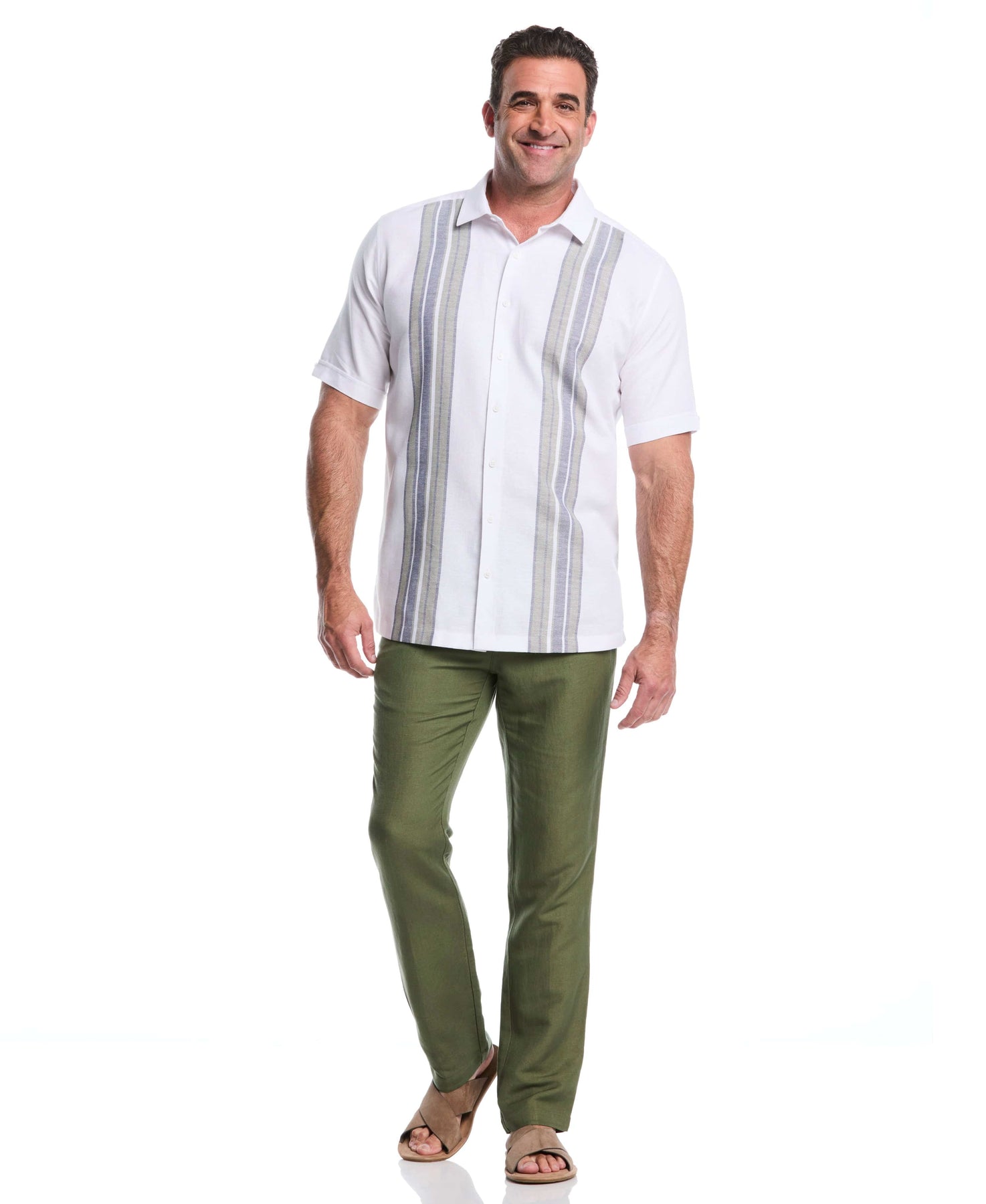 Add instant polish to your wardrobe staples with this Cubavera men's short sleeve button up shirt. Dobby cotton-linen fabric offers cool comfort and superior durability. Vertical tonal panels add a touch of contemporary style to any look. The classic point collar adds a crisp, clean finish for an effortlessly elegant look you can easily dress up or down.