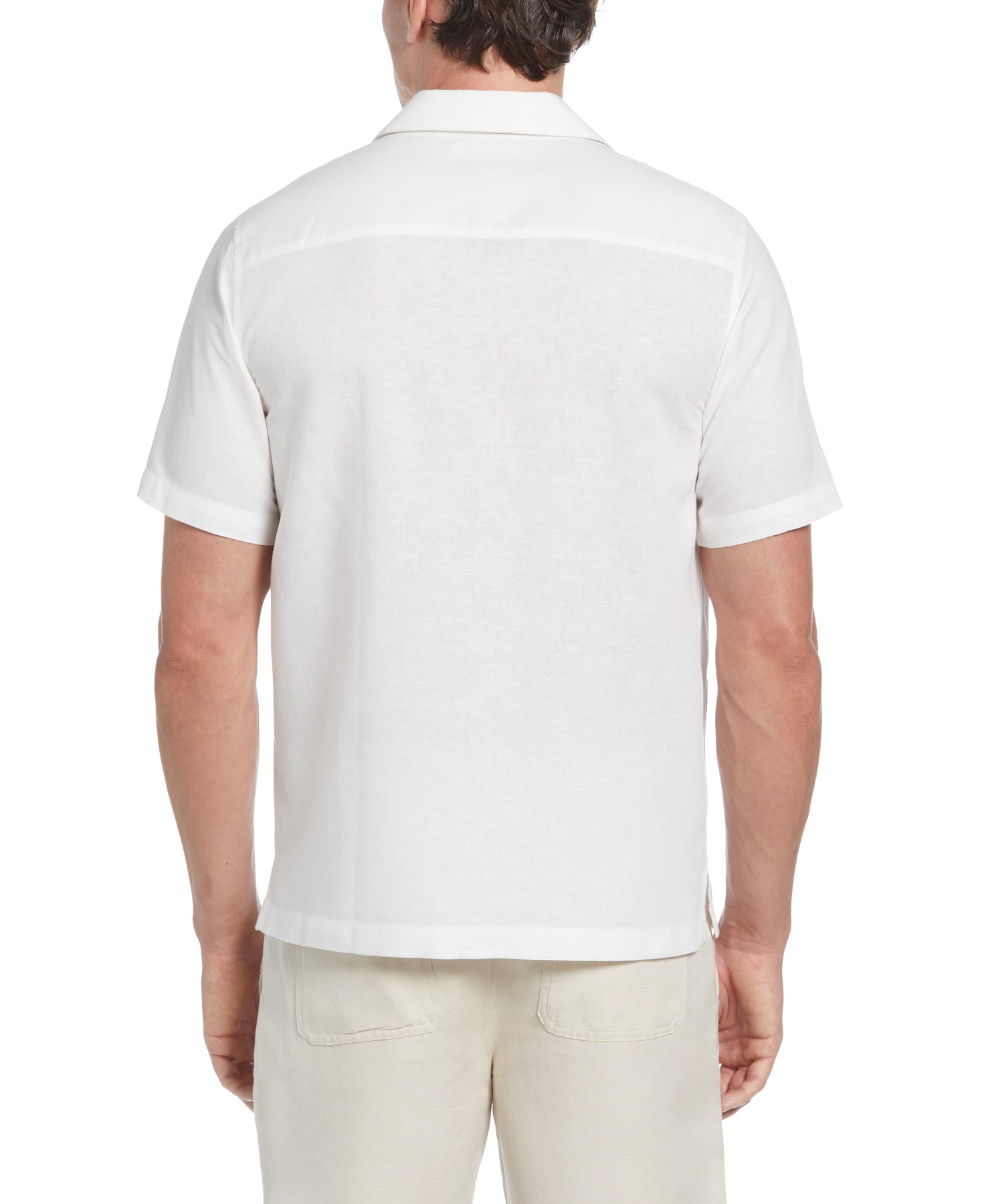 Keep your cool in this breathable short sleeve button-down shirt from Cubavera. It's crafted from a durable linen-cotton blend fabric for lightweight comfort in the warmer weather. Applique panels add sophisticated style while the solid color remains versatile enough to pair with any bottom. Two bottom pockets and a Cuban collar add classic tropical-inspired style.