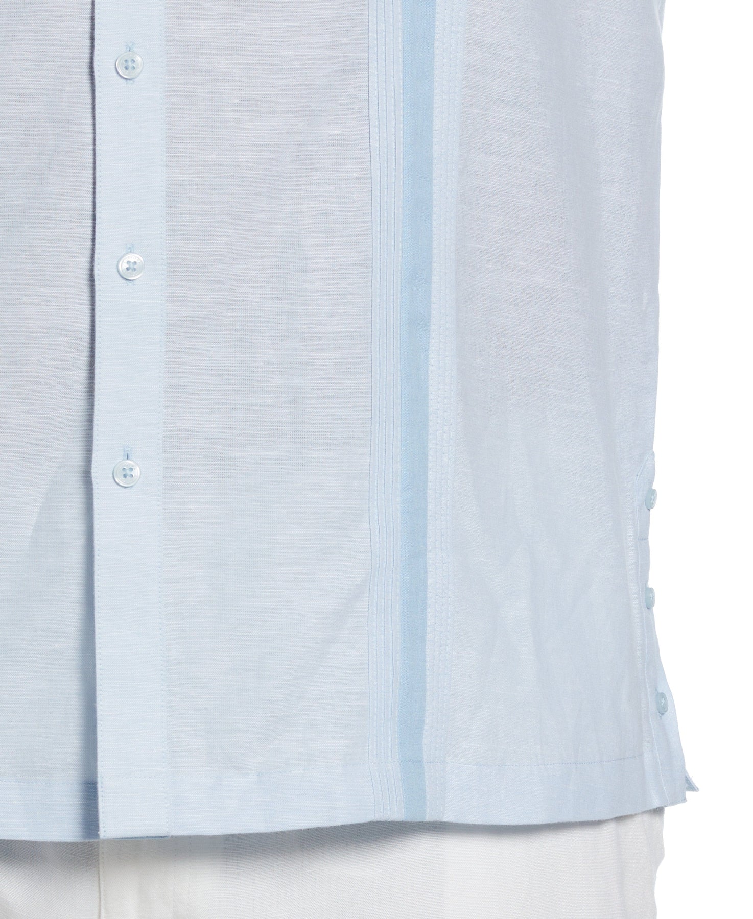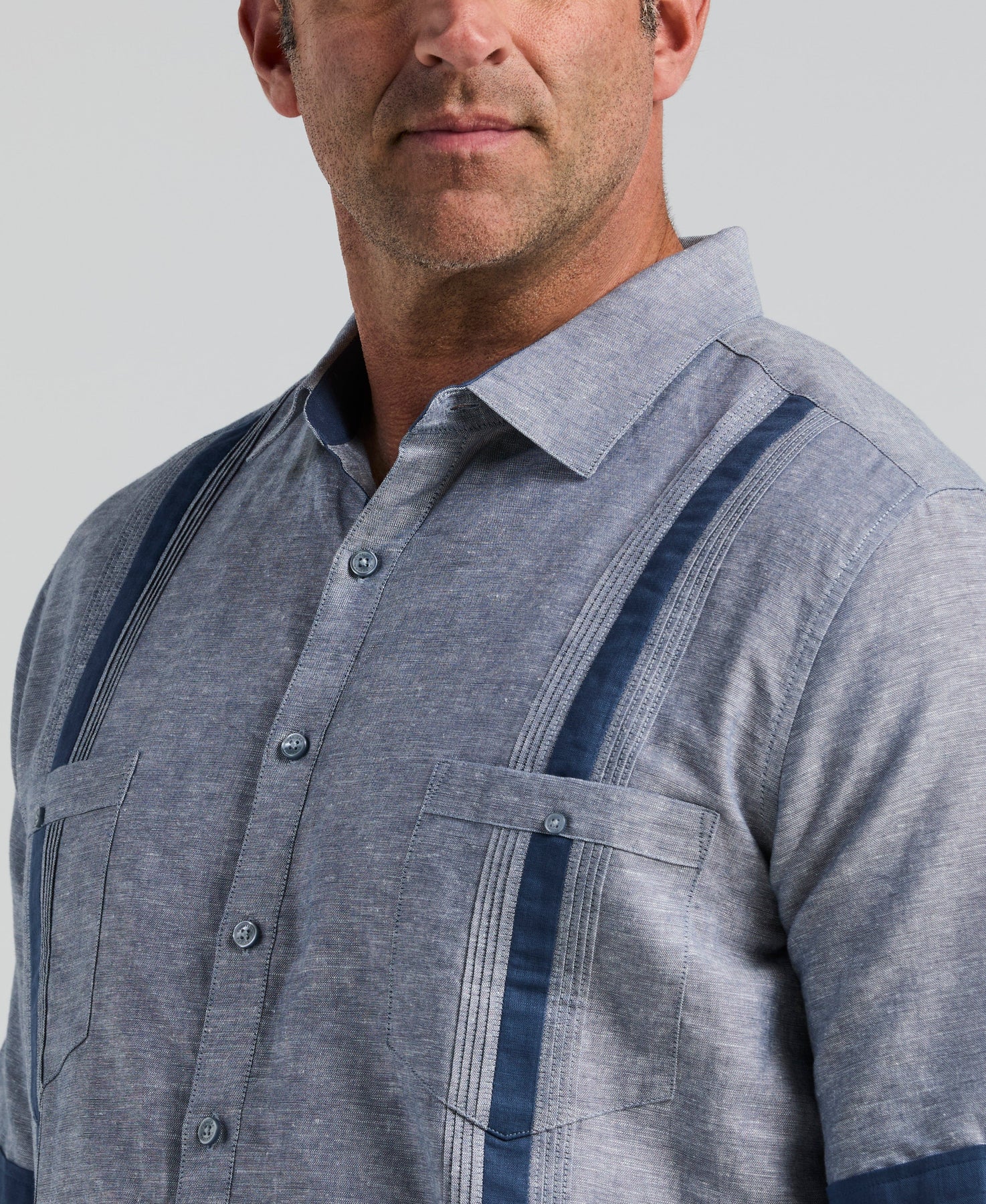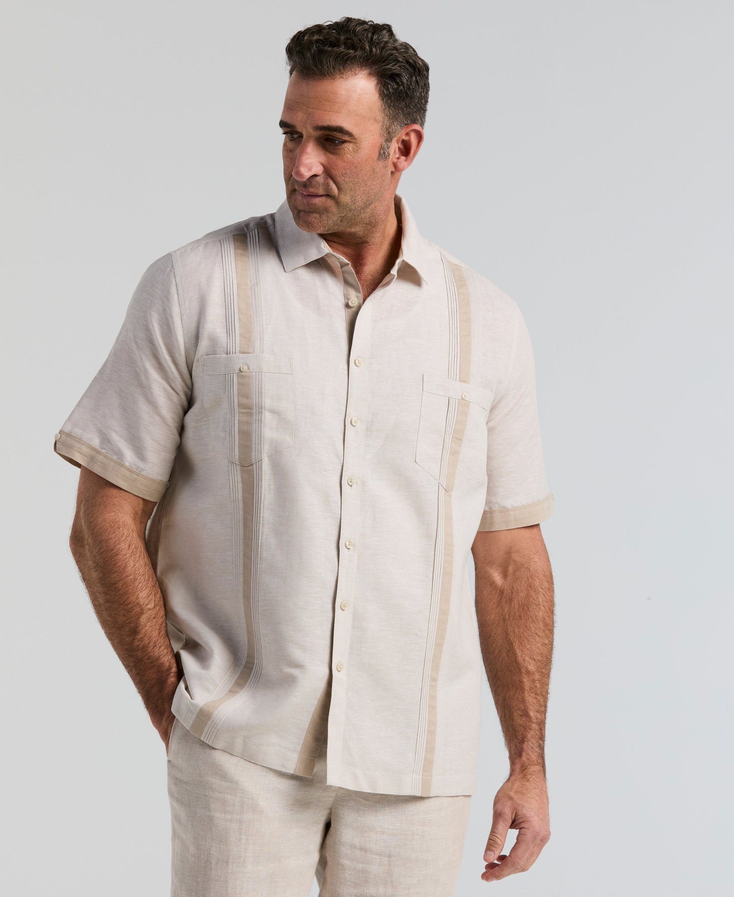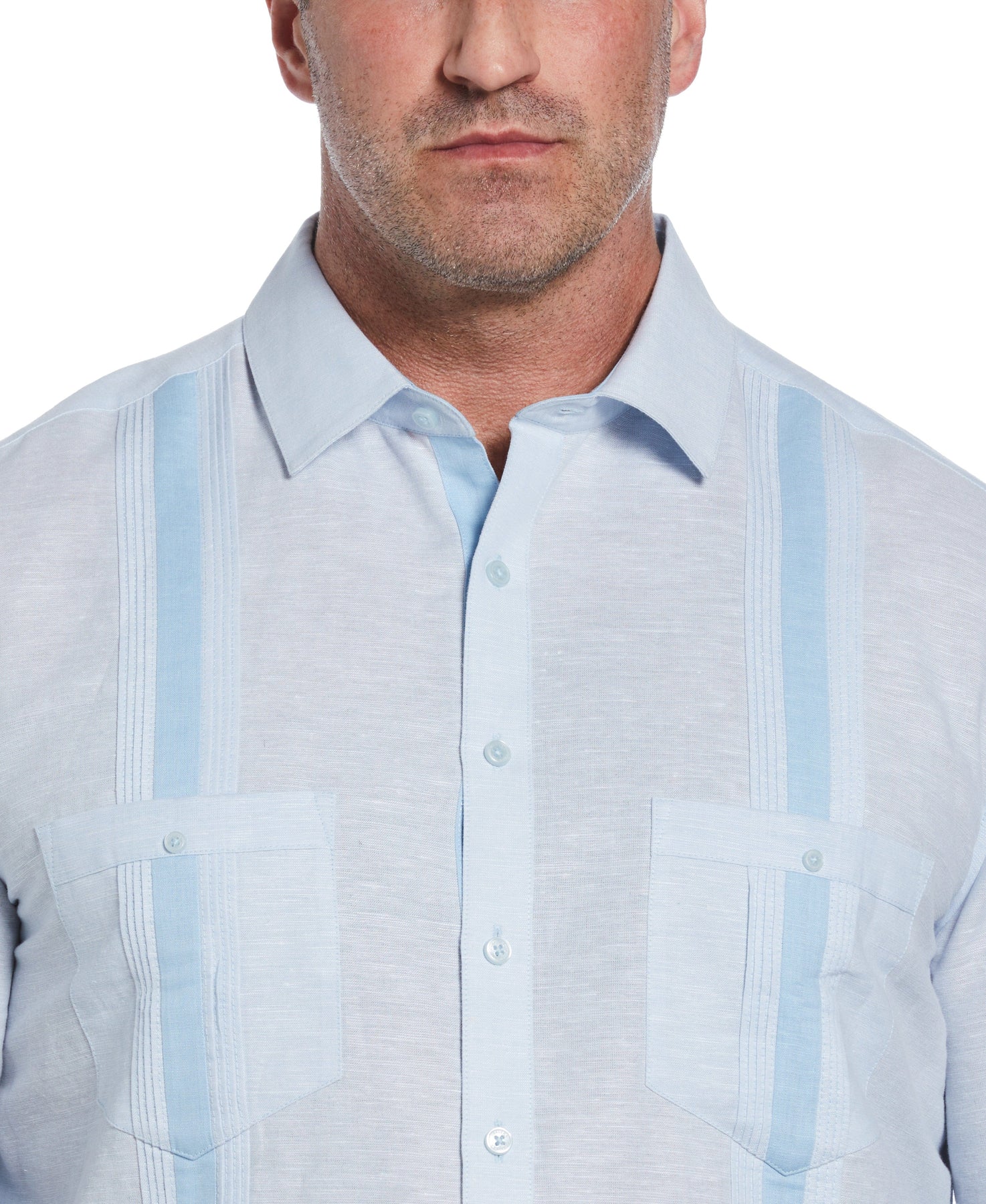 Designed for both style and comfort, this men’s guayabera shirt from Cubavera is crafted from a breathable linen blend fabric that’s been cross-dyed for a two-toned look. The shirt features two chest pockets and stripe detailing down the front panels and on the sleeves for contemporary casual style. Ideal for everyday wear, the men's short sleeve button-up shirt is made with a durable plain weave fabric that is machine-washable for easy care.