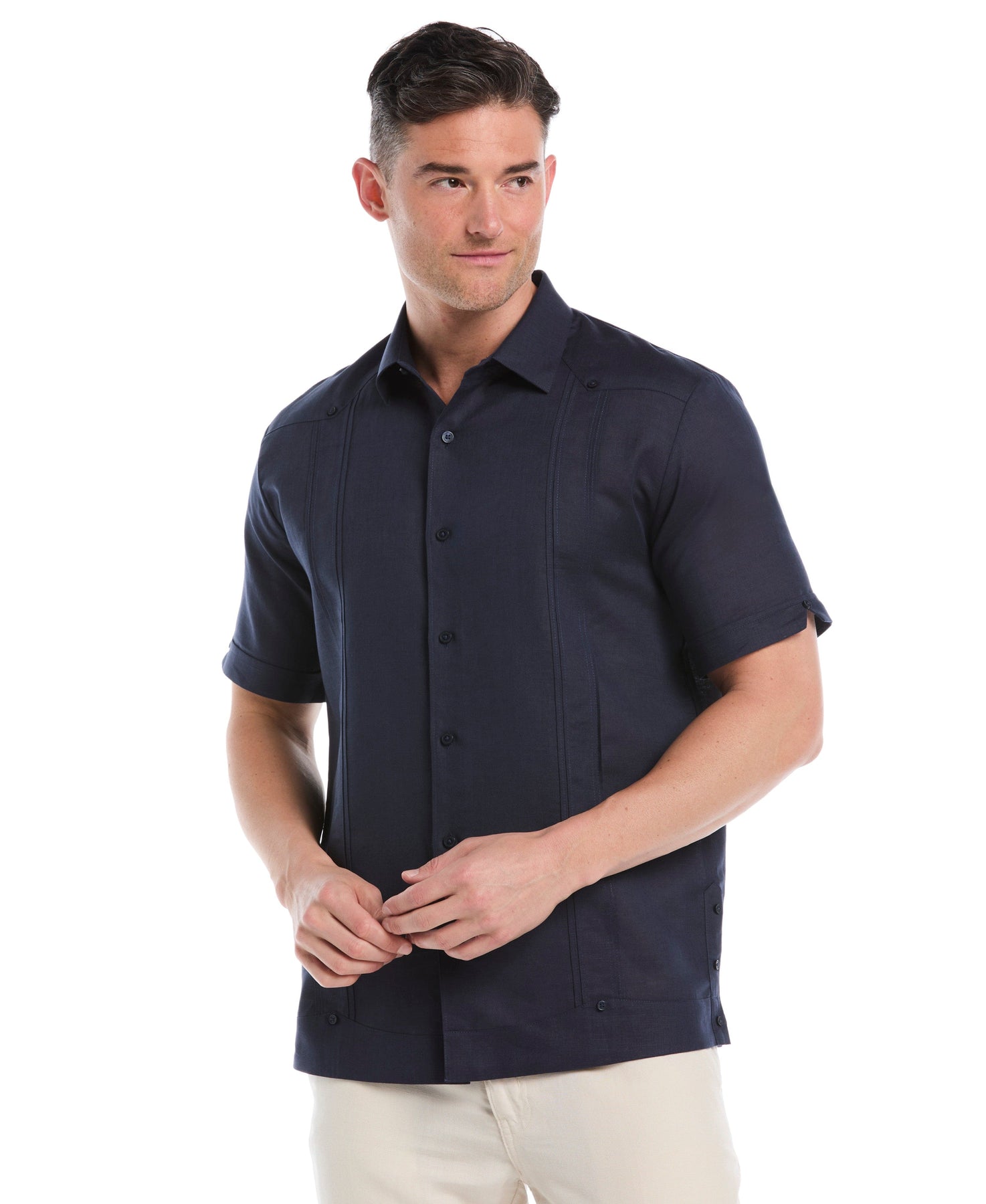 Elevate your weekend looks with this Cubavera men's linen blend guayabera shirt. Breathable linen-cotton blend delivers cool comfort without sacrificing durability. Classic design with vertical tucking elevates your warm-weather wardrobe. A timeless point collar completes this effortlessly cool button-down shirt you'll want to wear everywhere.