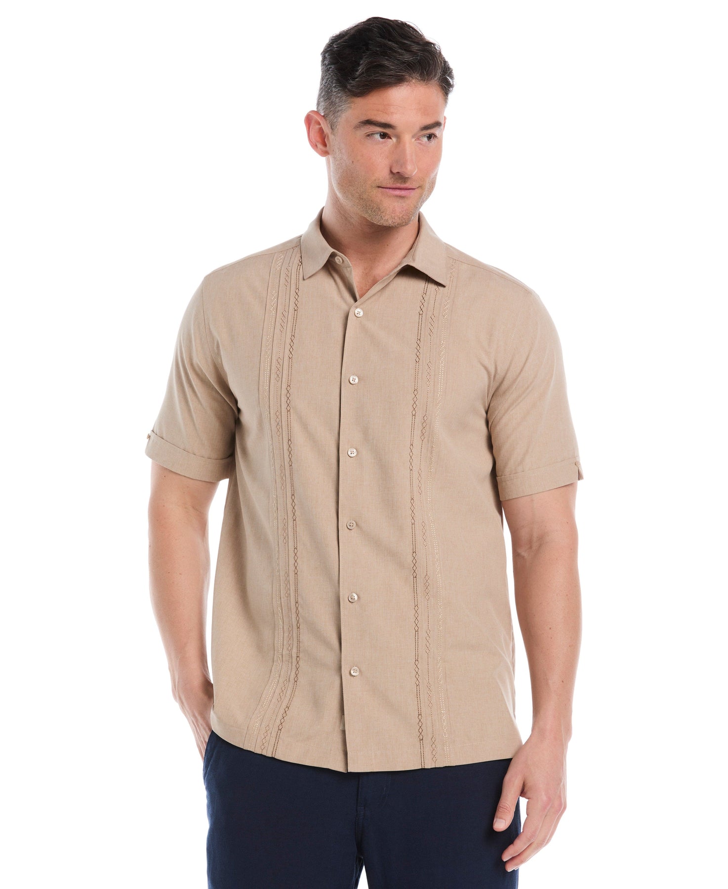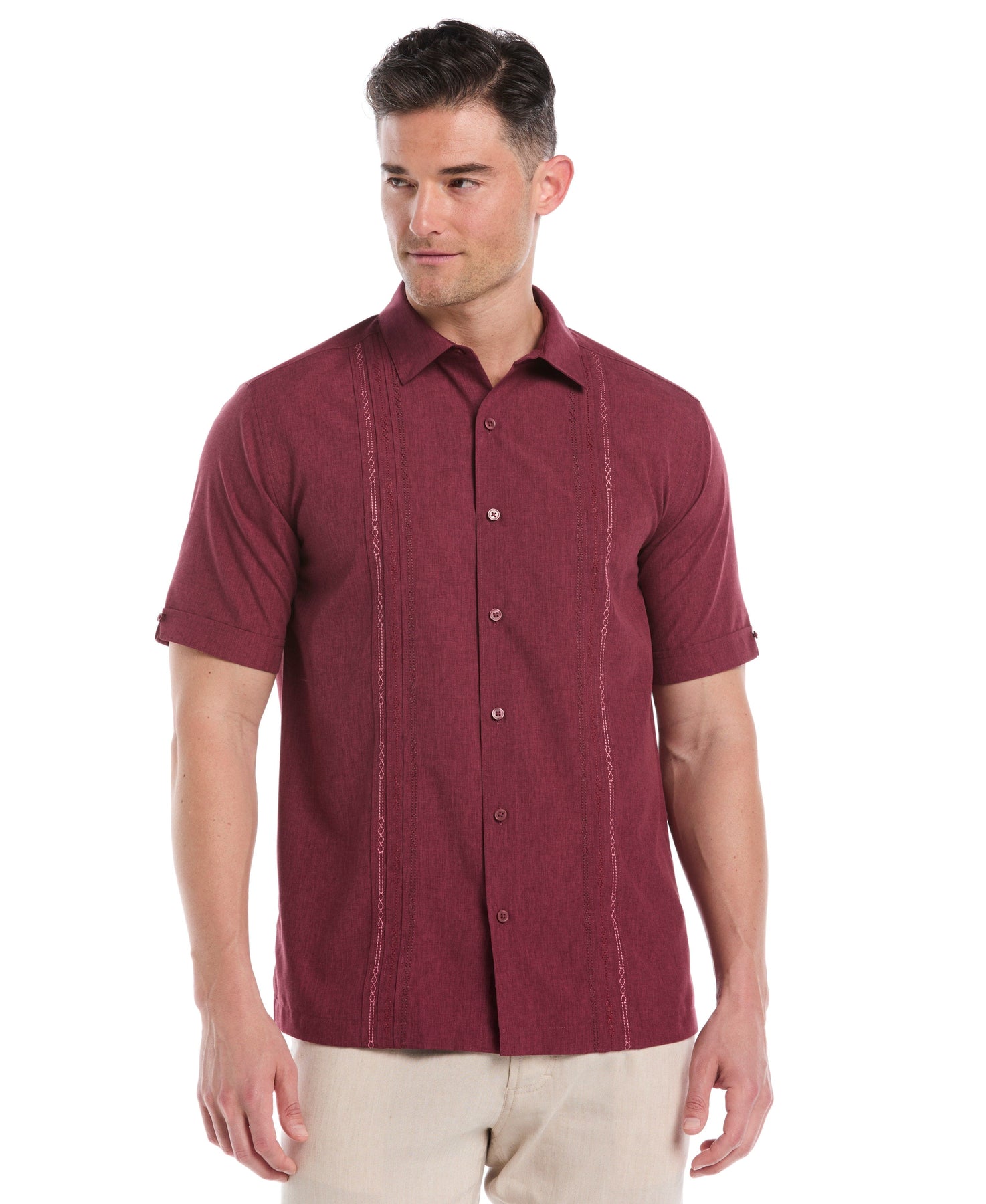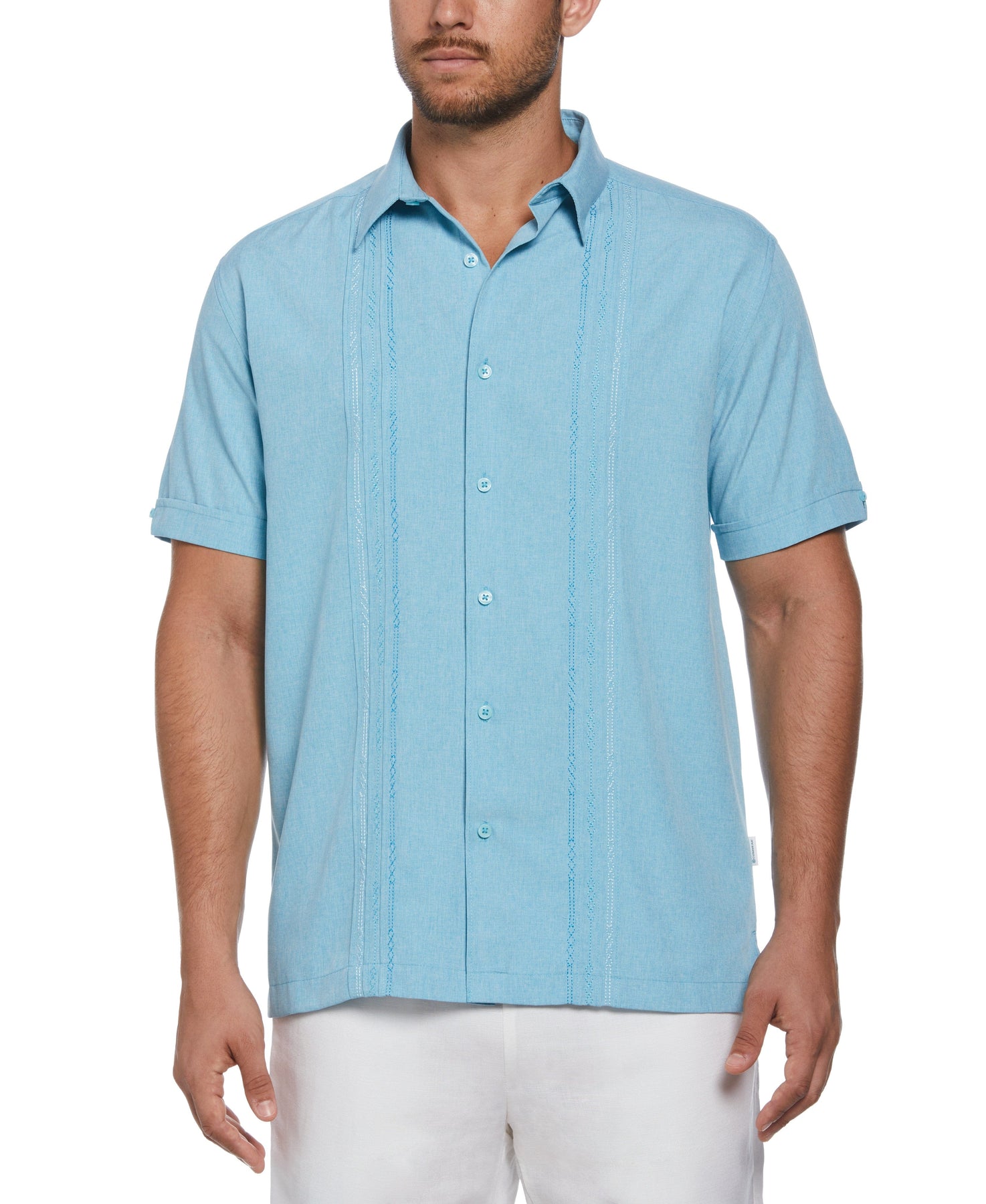 Upgrade your closet basics with this stylish Cubavera men's short sleeve button up shirt. Polyester chambray offers softness with great durability that you can wear again and again. Eye-catching geo embroidery adds a luxe touch. Pair this versatile short sleeve shirt with shorts for casual events or elevate your style for dressy occasions.