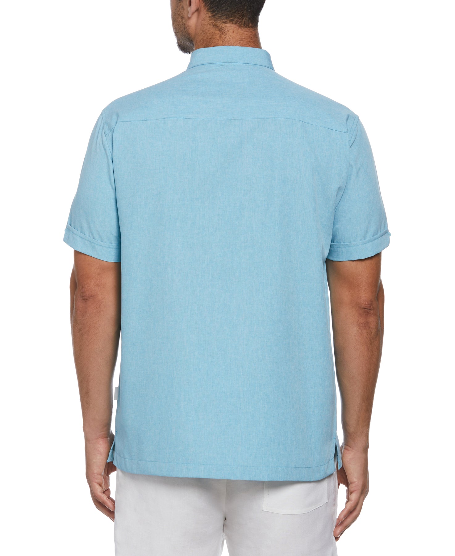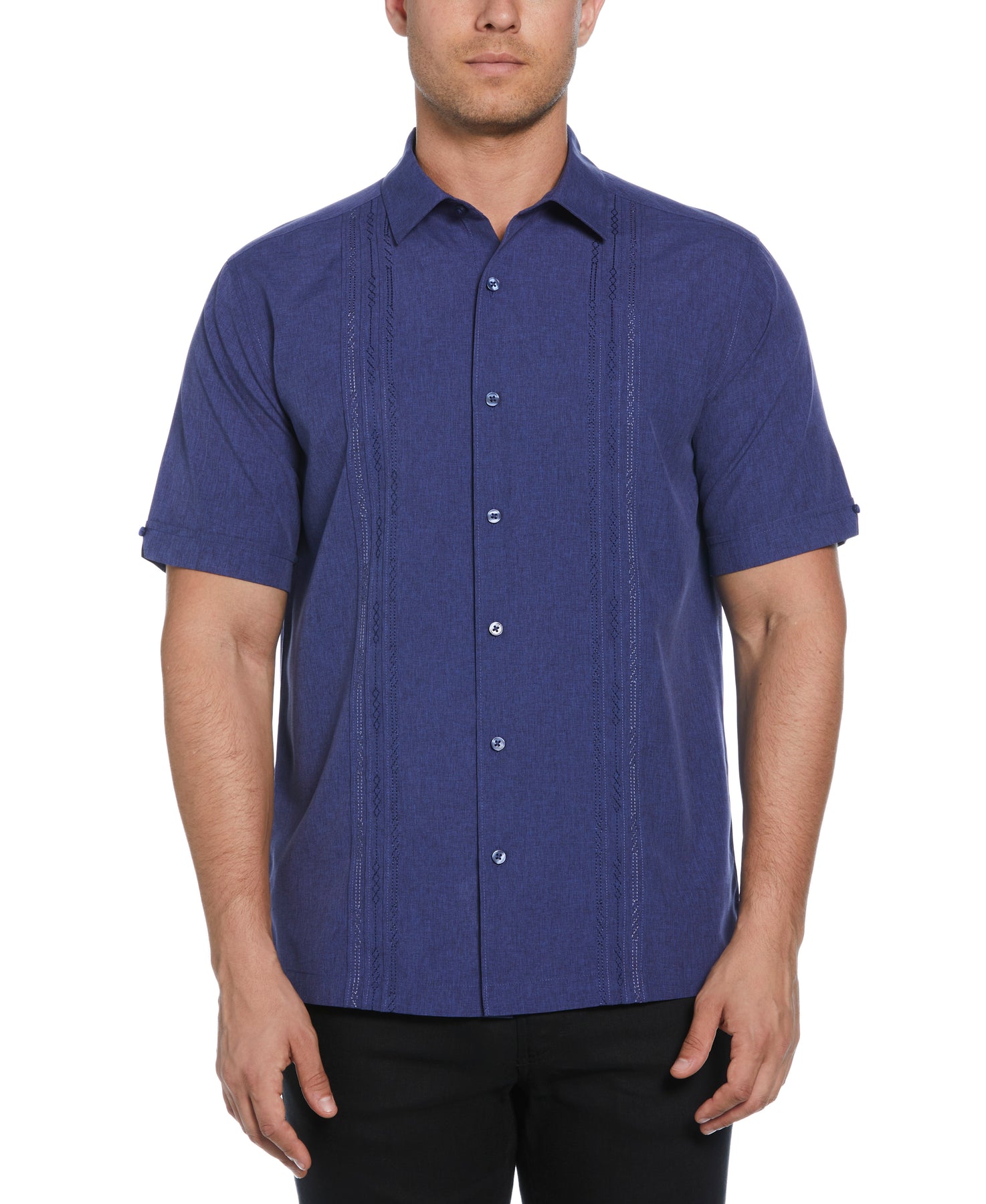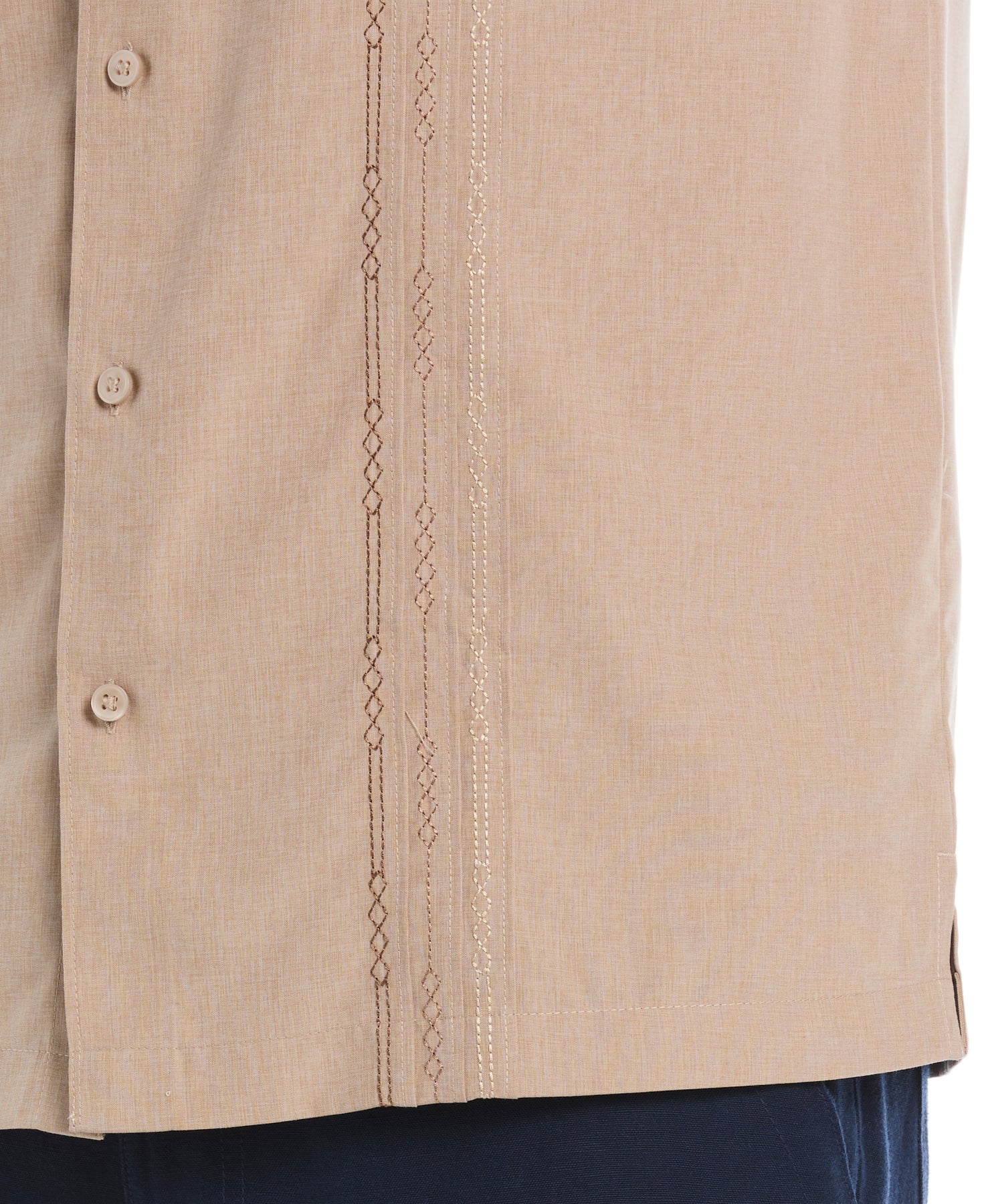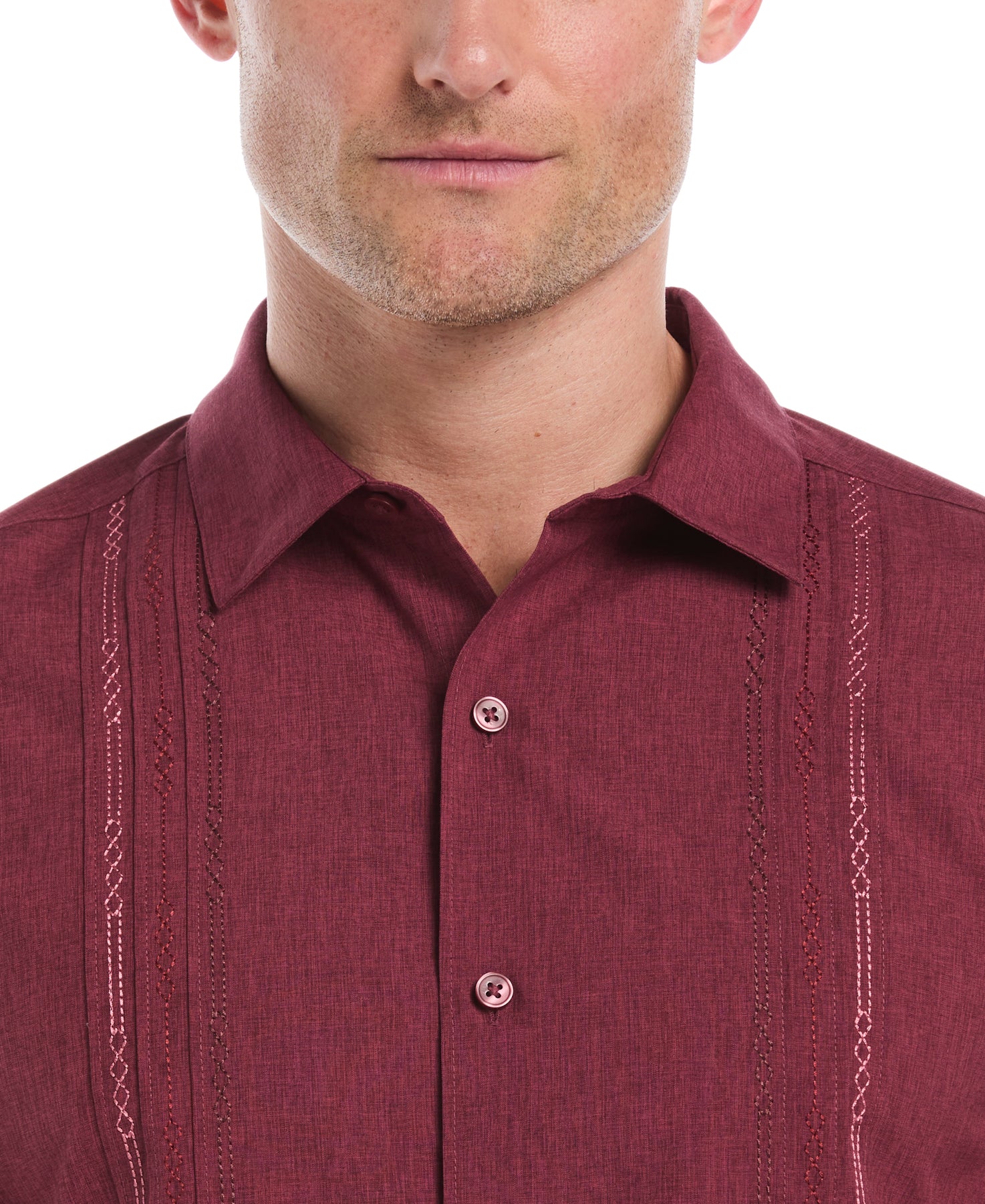 Upgrade your closet basics with this stylish Cubavera men's short sleeve button up shirt. Polyester chambray offers softness with great durability that you can wear again and again. Eye-catching geo embroidery adds a luxe touch. Pair this versatile short sleeve shirt with shorts for casual events or elevate your style for dressy occasions.