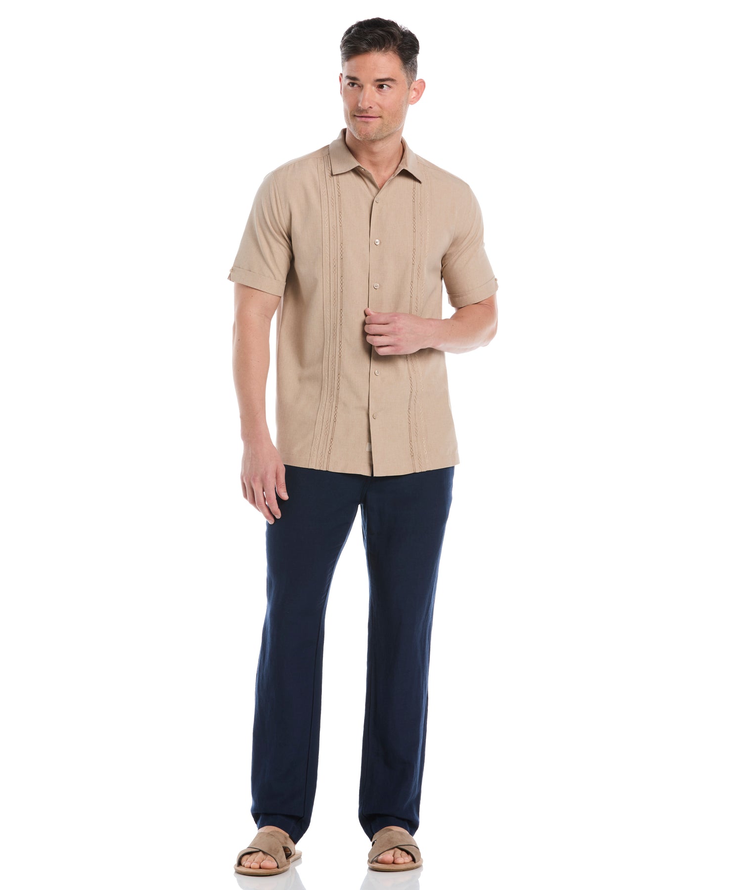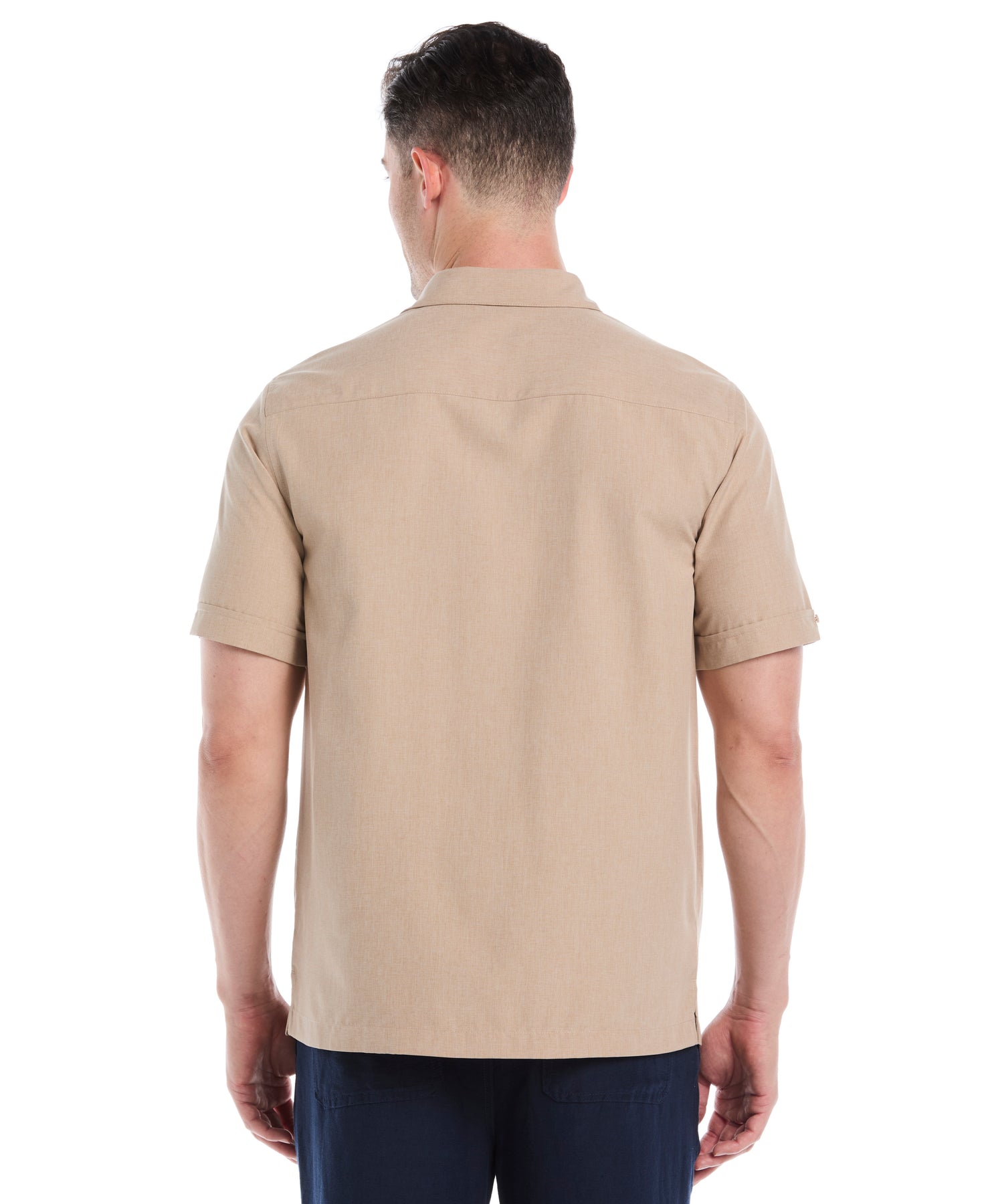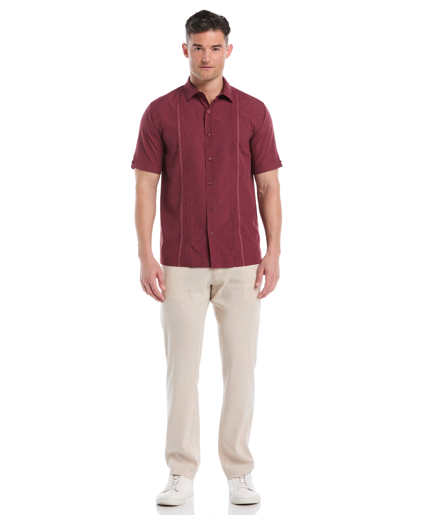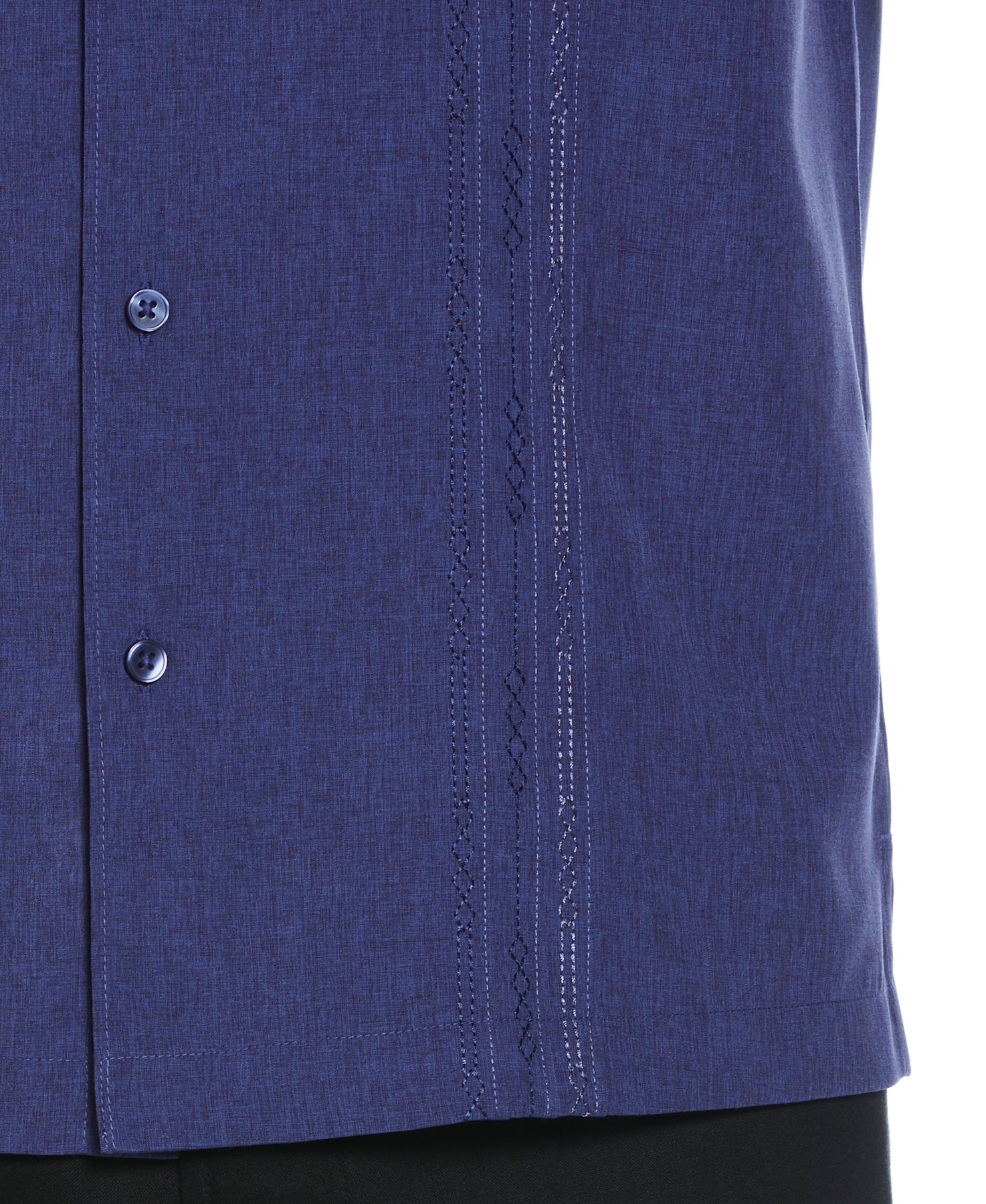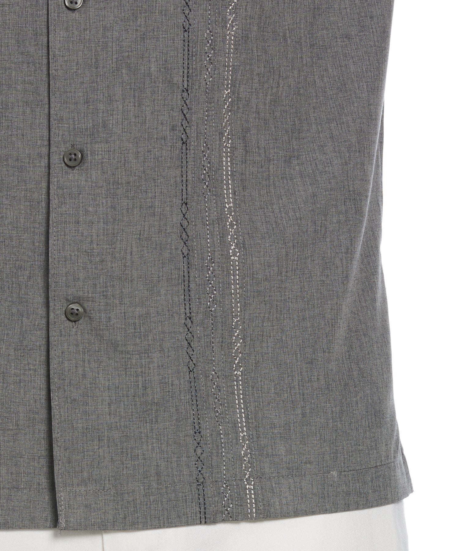 Upgrade your closet basics with this stylish Cubavera men's short sleeve button up shirt. Polyester chambray offers softness with great durability that you can wear again and again. Eye-catching geo embroidery adds a luxe touch. Pair this versatile short sleeve shirt with shorts for casual events or elevate your style for dressy occasions.