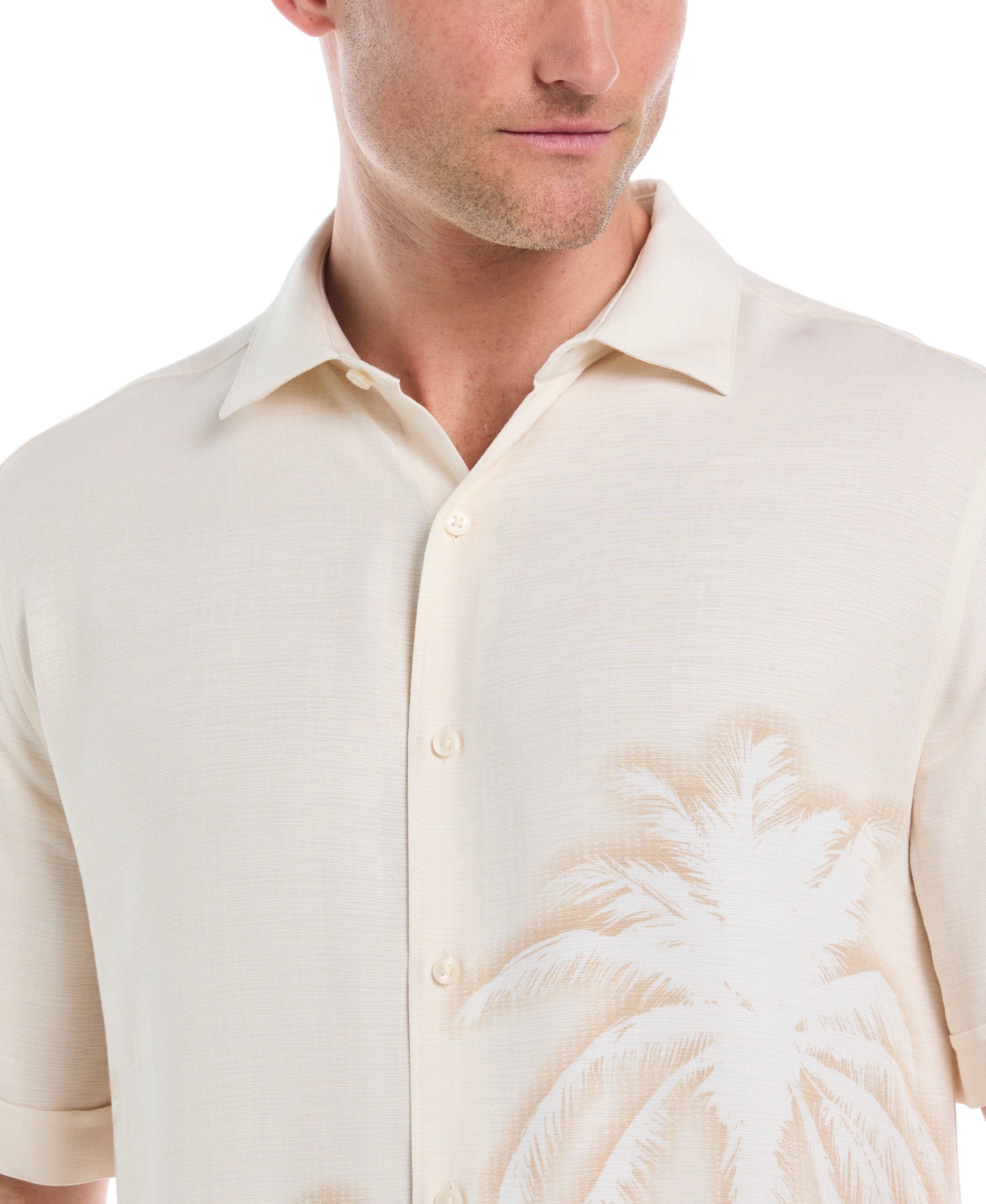 Evoke a relaxed, island-ready vibe with this Cubavera men's short sleeve button up shirt. Crafted from textured viscose, this short sleeve shirt drapes softly for all-day comfort and eye-catching style. The intricate all-over indigo batik palm print delivers sophisticated resort vibes. A polished point collar completes this button-down shirt for an instantly elevated warm-weather style.