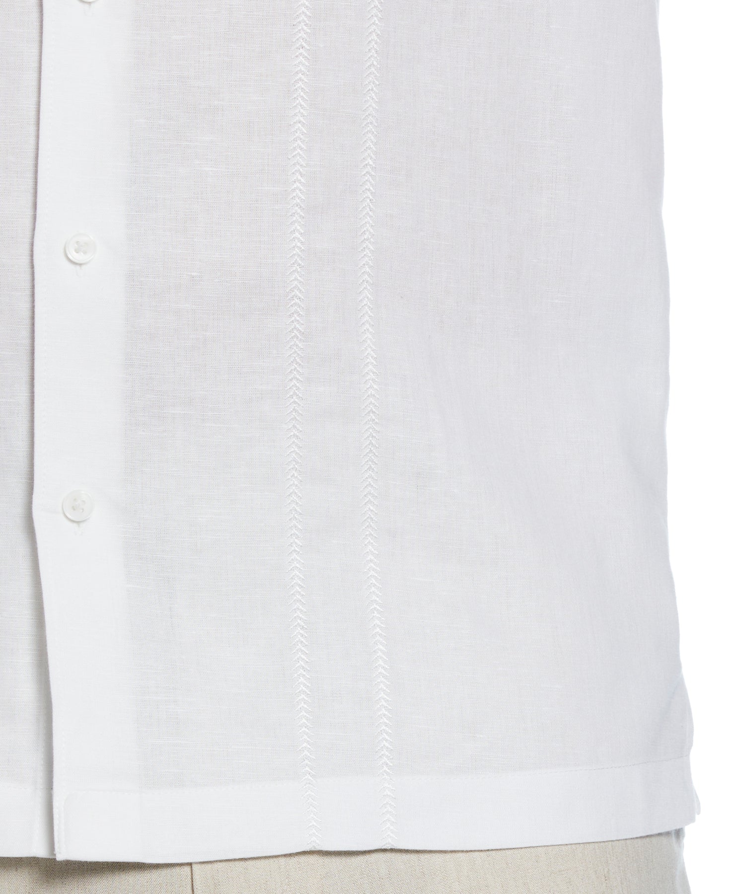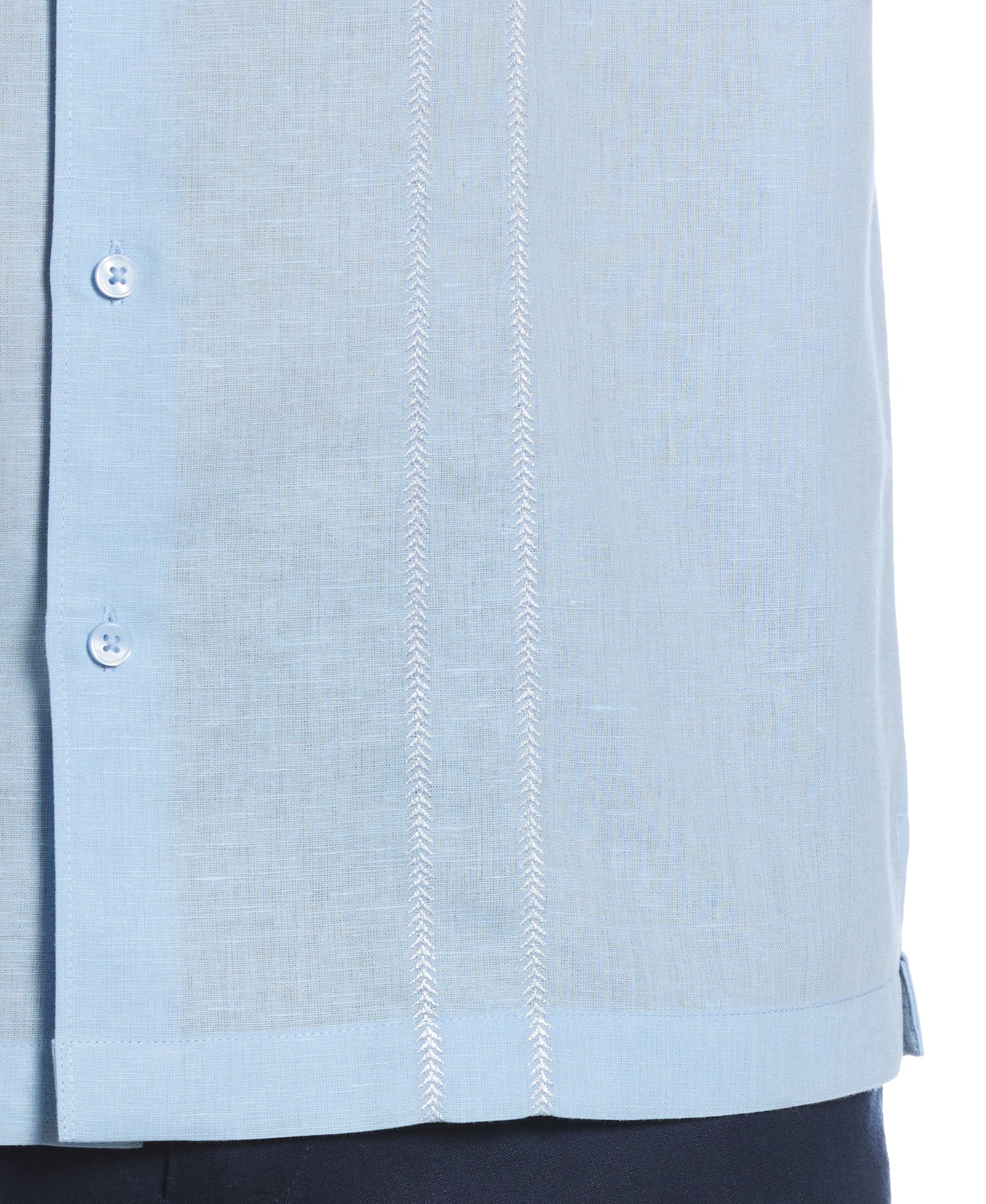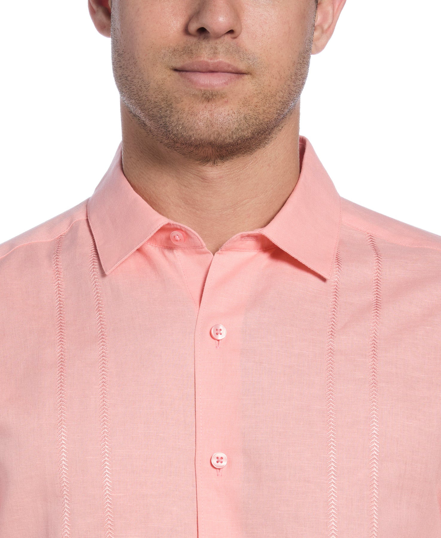 Style basics have never looked so good with this Cubavera men's short sleeve button up shirt. Breathable plain weave linen blend fabric delivers cool comfort without sacrificing durability. Embroidered vertical stripes elevate the look with a touch of lux, while a classic point collar adds instant polish. Pair this versatile short sleeve button up with shorts for elevated casual style or top off your favorite dress pants for a night out.