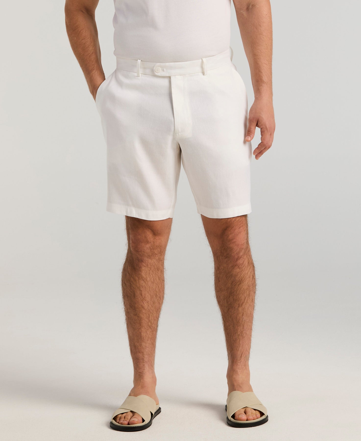 These Cubavera linen shorts are a cool look for a hot day. Crafted from a breathable linen blend with durable plain weave fabrication, these men's shorts offer lightweight comfort and style. A flat front with extended tab-front button closure creates a smooth silhouette while a touch of stretch provides a flexible fit. Top them off with a colorful Cubavera button-down shirt for a striking look.