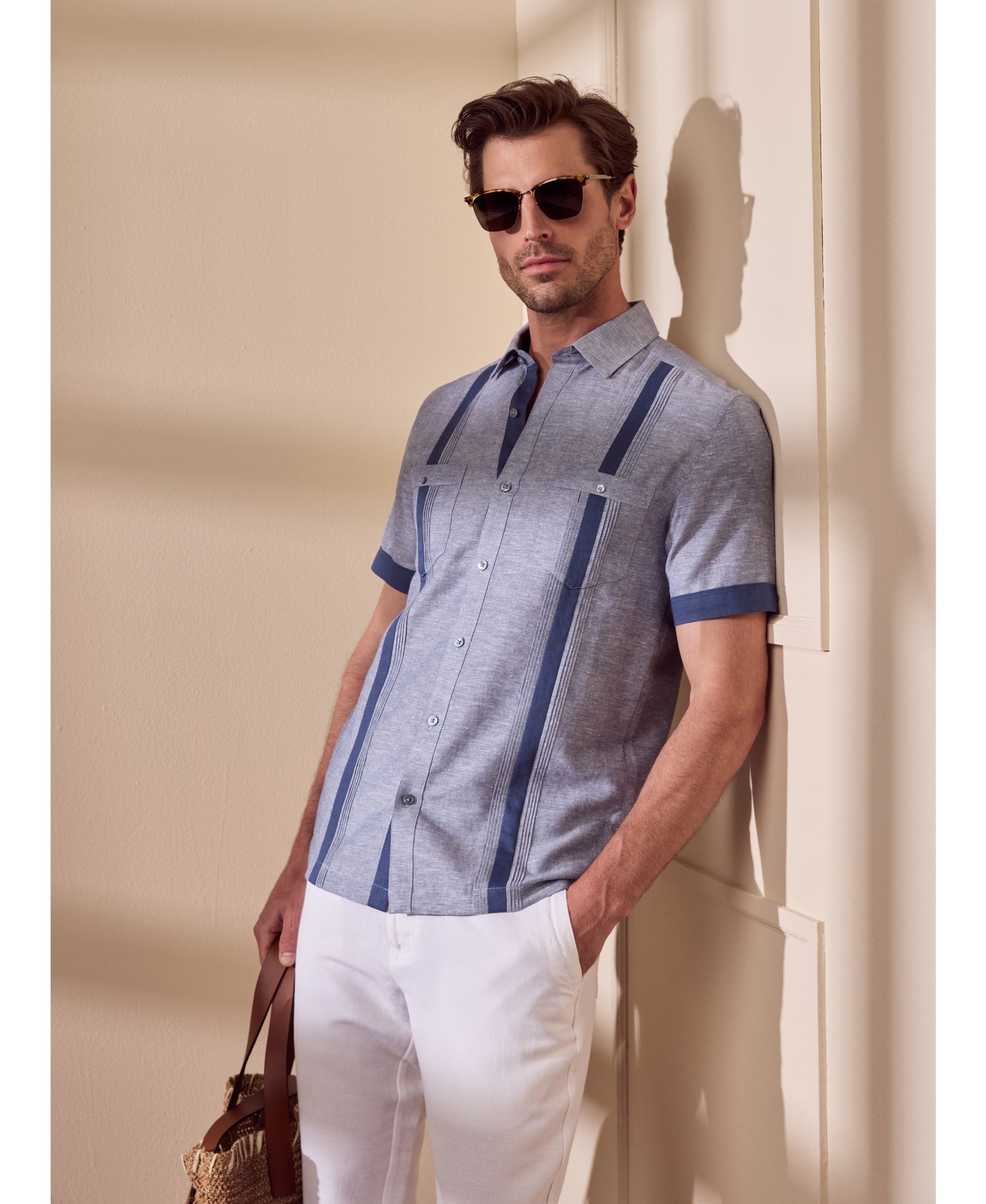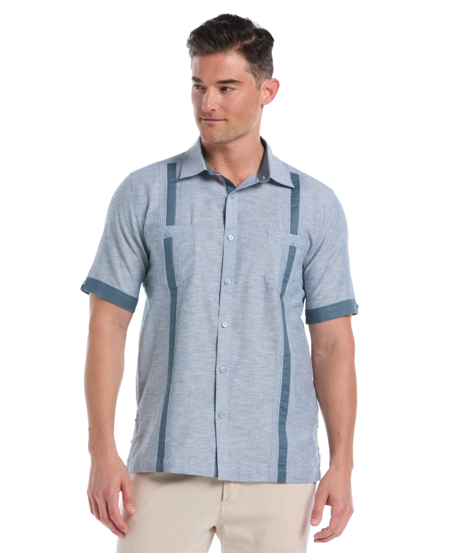 Classic style gets an effortless upgrade with this Cubavera men's short sleeve shirt. A plain weave linen blend ensures comfortable wear and lasting durability. This refined cross dye look features tonal color and subtle texture that pairs easily with any outfit. A classic point collar gives a versatile touch you can dress up or down.