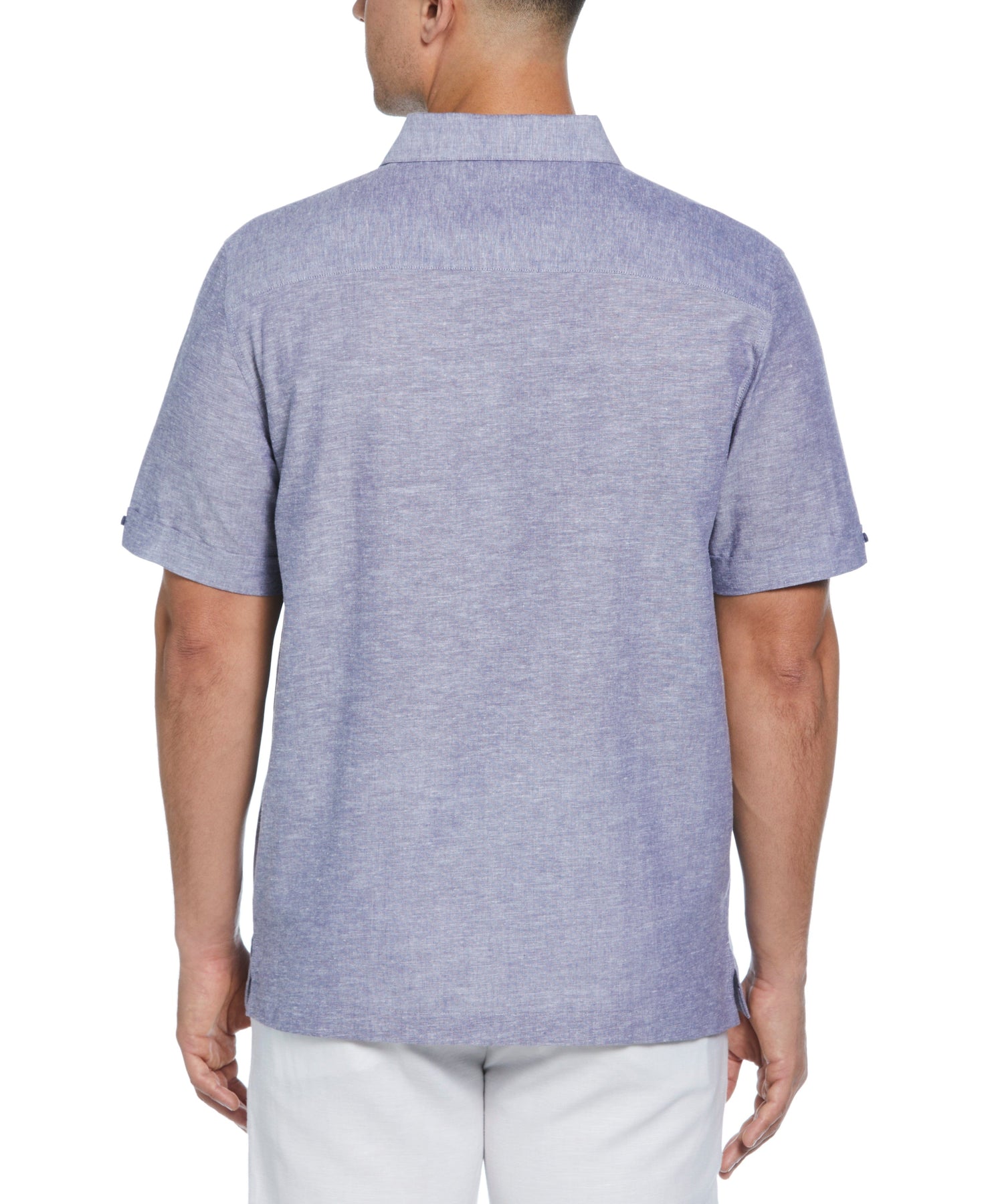 Show off your stellar style game in this Cubavera men's short sleeve button up shirt. Breathable plain weave linen blend fabric delivers cool comfort without sacrificing durability. Contrasting vertical stripes add visual interest to your look while keeping things classic. Pair with shorts for an elevated casual look or throw on with dress pants for a night out. A timeless point collar finishes this short sleeve button up you'll want to wear again and again.