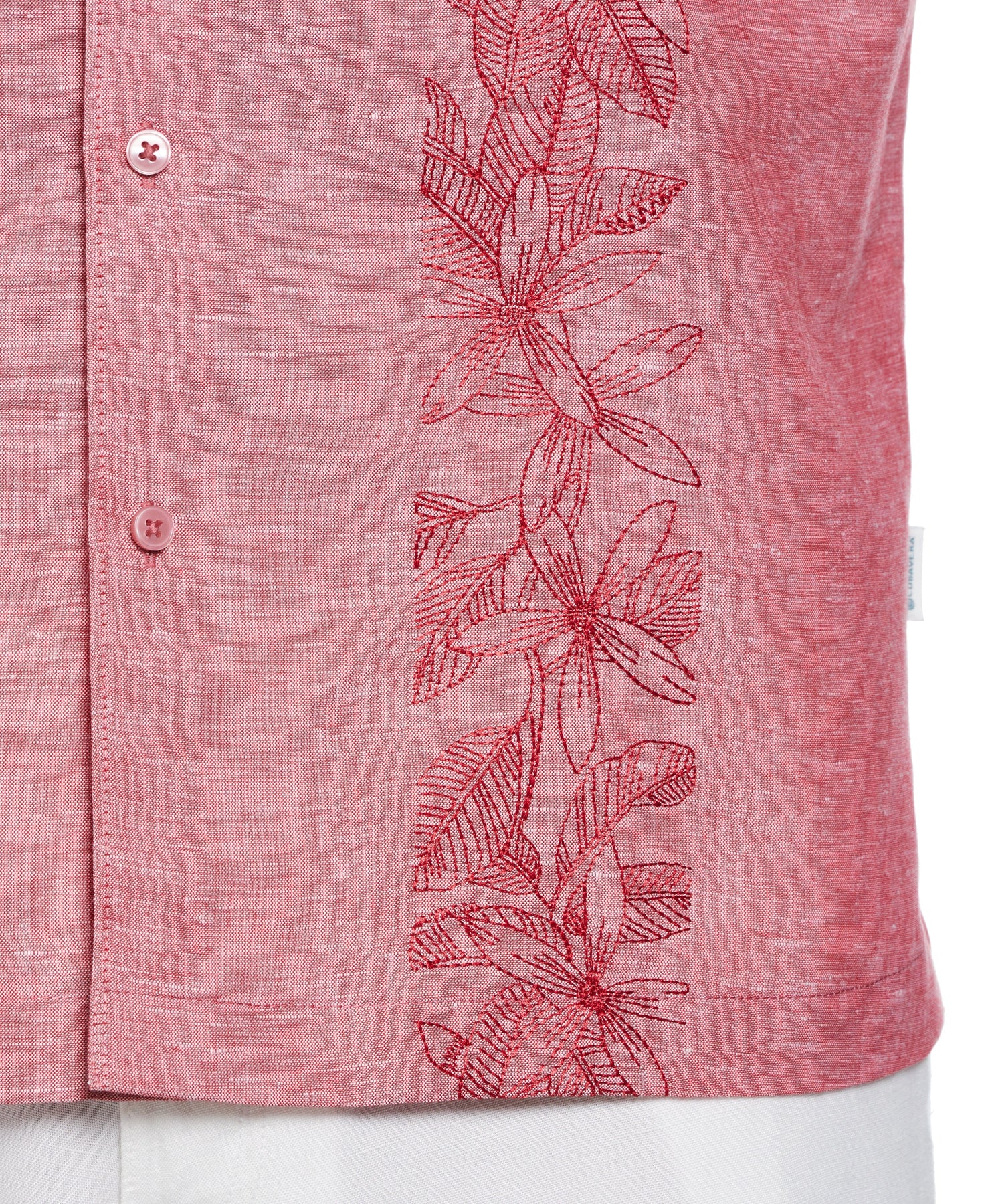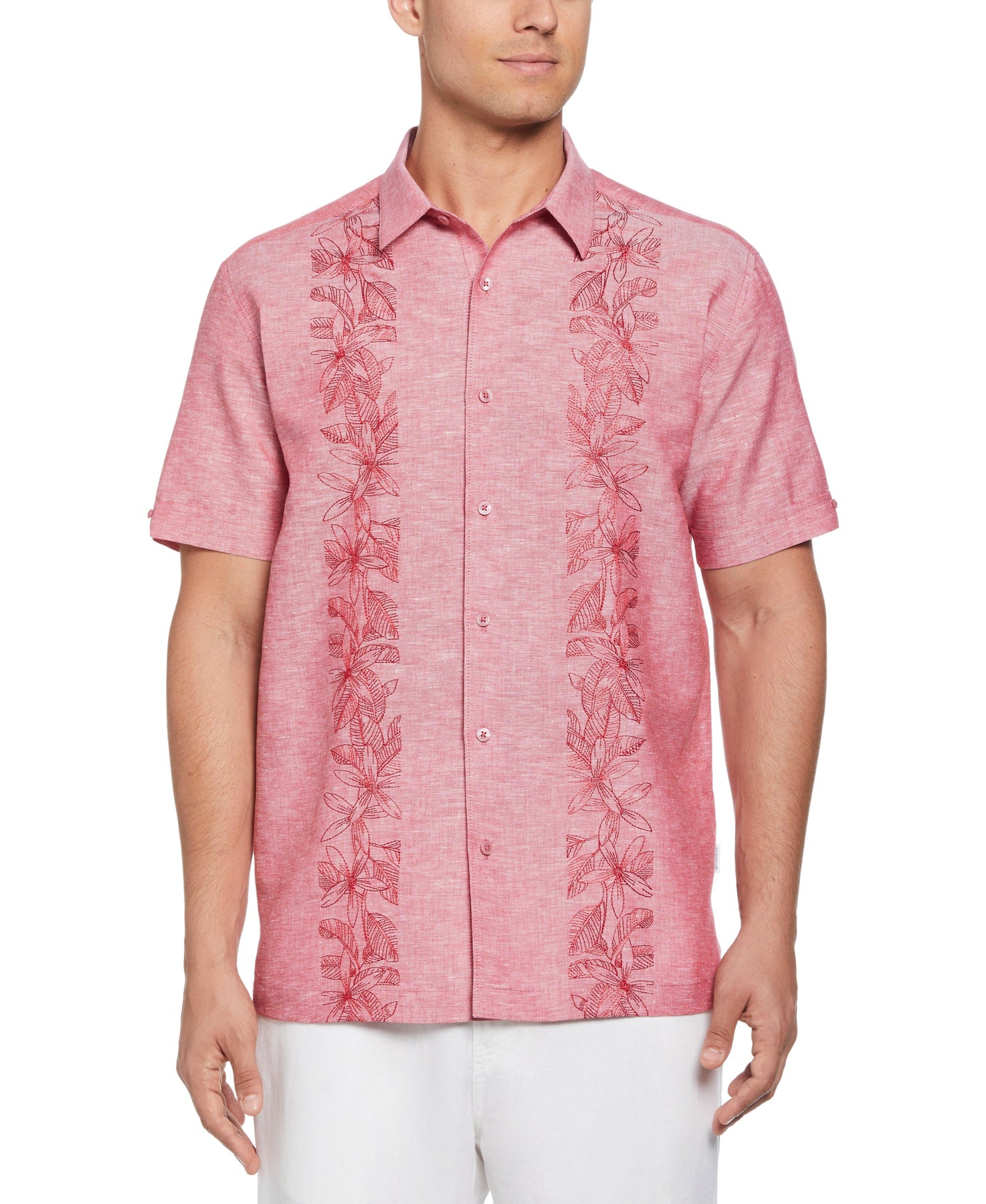 Made with a luxuriously light and breathable linen blend fabric, this Cubavera men’s short sleeve shirt is a great way to stay cool and channel some island vibes. The men’s tropical shirt is made with durable plain weave fabric for long-lasting wear, and the material is cross dyed for a two-toned modern look. Tropical flowers embroidered down the front panels add eye-catching flair, and it’s topped off with a crisp point collar.