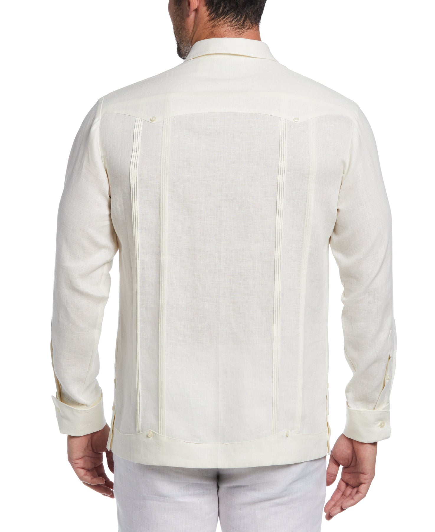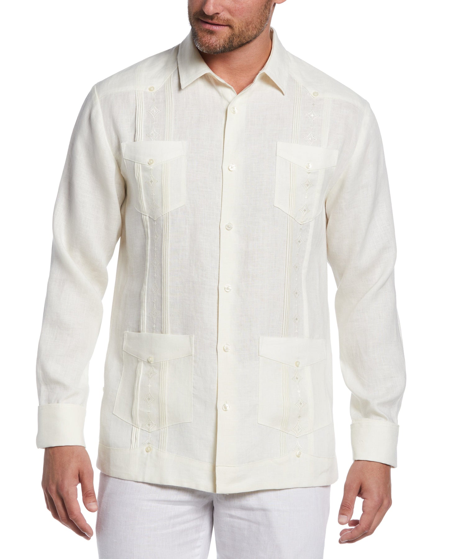 Embrace timeless Latin style in this men's guayabera shirt from the Cubavera Collection. Embroidered pintuck detailing on the front and back along with the four buttoned front pockets give this classic wardrobe staple its distinctive tropical-inspired style. This breathable linen shirt features plain weave fabrication for lasting durability and comfort. The French cuffs can be worn with the provided buttons or fastened with your own cufflinks for an elevated custom look.