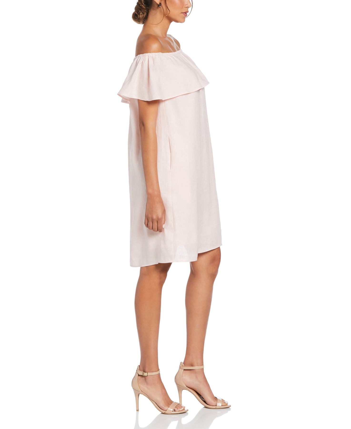 Look and feel your best in this airy off the shoulder dress from Cubavera. This fashionable knee length dress is a fun choice for day or night with its flattering ruffled top layer and fully lined interior. The breathable 100% linen fabric helps keep you feeling cool and the convenient on-seam pockets are a welcome finishing touch.
