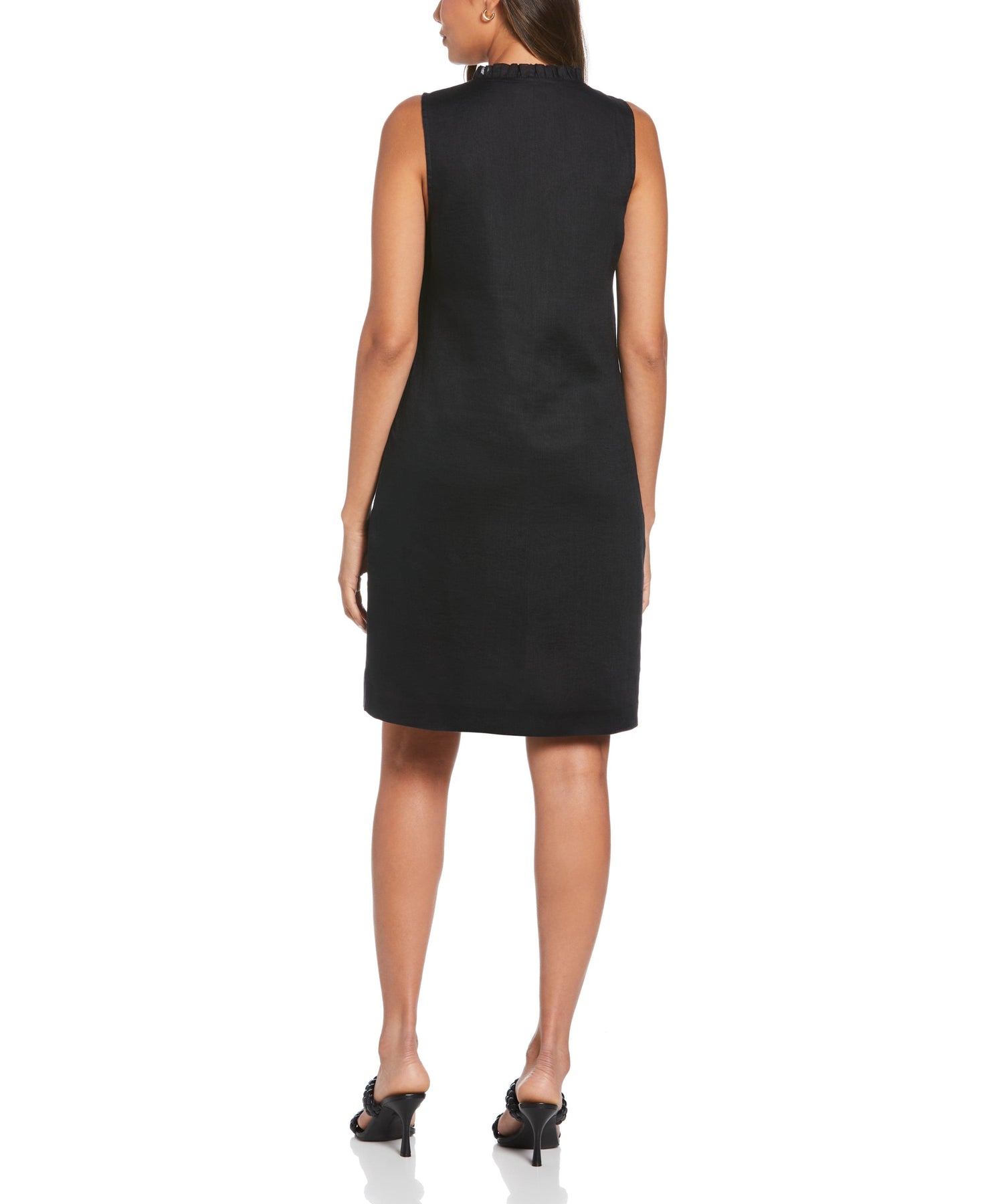 A cool style for the warm weather, this Cubavera women's dress is designed to feel as good as it looks. The breathable 100% linen fabric and sleeveless silhouette of this above-the-knee dress offer airy comfort when the temperatures rise. Ruffled trim at the V-neckline adds eye-catching feminine detail to this solid linen dress.